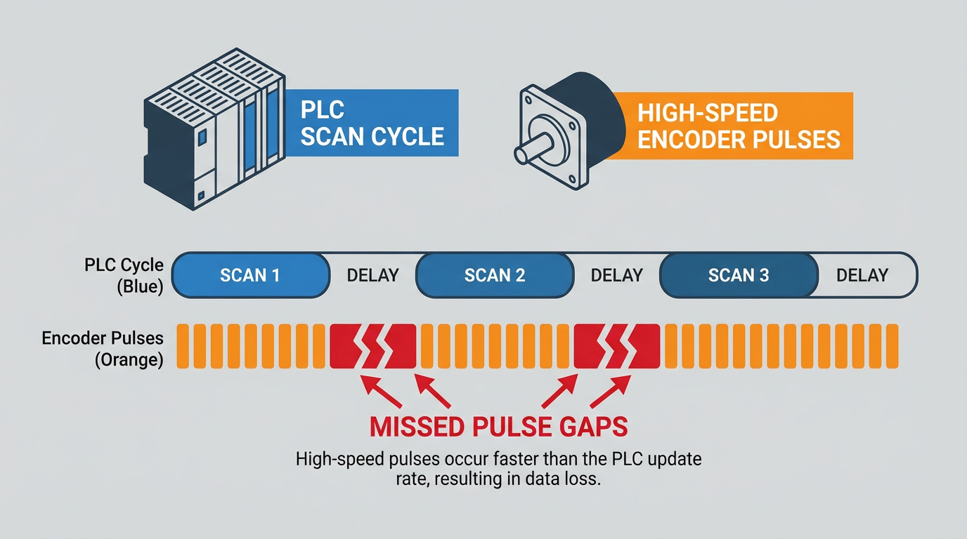 The reason you need a high‑speed counter is simple. A normal PLC input updates at the pace of the PLC scan. As Maple Systems points out, that scan‑rate input often “will not have the scan cycle that will allow [you] to count these signals.” You might be scanning every 10 or 20 ms; meanwhile, your encoder may be toggling hundreds or thousands of times per second. You can easily miss most of the edges.