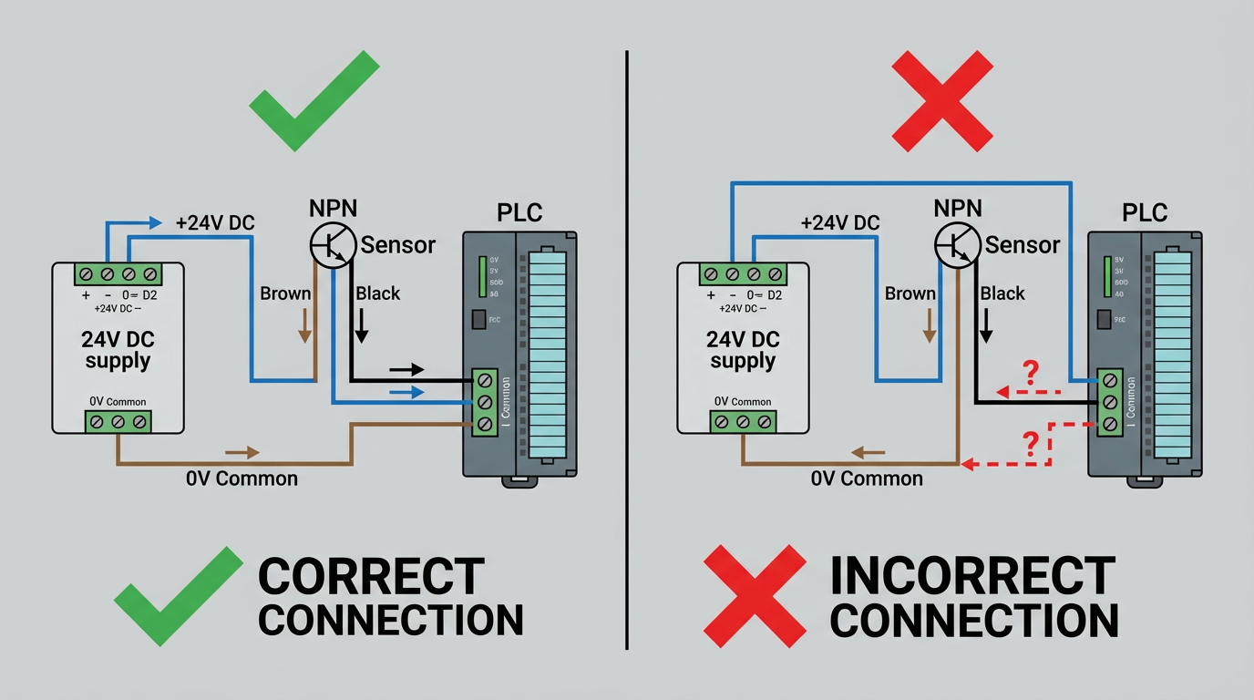 The details matter. In an AutomationDirect forum thread on a CLICK PLC pulse counter, the flow meter had an NPN transistor output. The correct wiring required tying the PLC common terminal to the positive 24 V supply. Mis‑wiring the common left the input circuit dead, and of course nothing counted until that was corrected. That is a classic trap: an NPN sensor in a sourcing input configuration will never register.