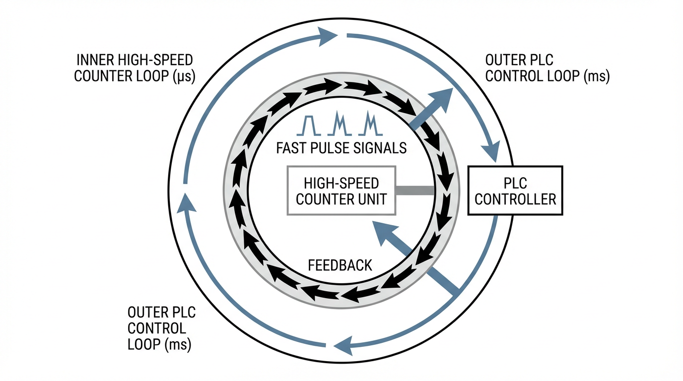 On top of the raw pulse rate, you must think about the outer loop that consumes that data. On Control.com, the Schneider M340 case study has an HSC rated to 60 kHz easily handling a 3 kHz signal while the PLC reads its results every 100 ms. That is the ideal arrangement: the counter’s inner loop is fast enough to be effectively continuous, and the PLC outer loop simply polls the derived values.