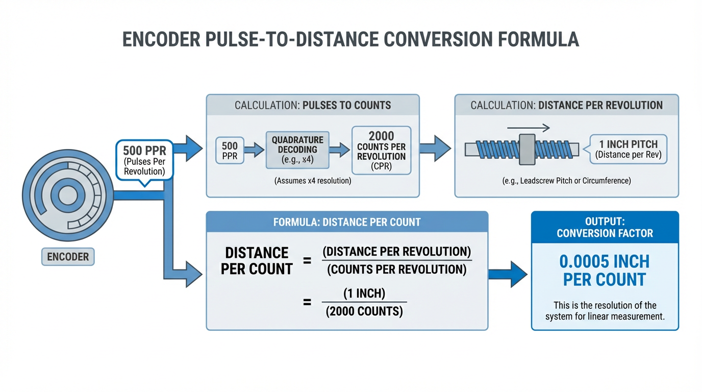 In encoder feedback, you normally know the pulses per revolution, and you know how far one revolution moves your load. Fuyumotion walks through this with a general “pulse constant” concept: pulses per revolution divided by distance per revolution gives pulses per unit distance. Using imperial units, if your screw advances 1.0 in per revolution and your encoder is 500 pulses per revolution in quadrature at 4x, you have 2,000 counts per in. That means each count is about half a thousandth of an inch.
