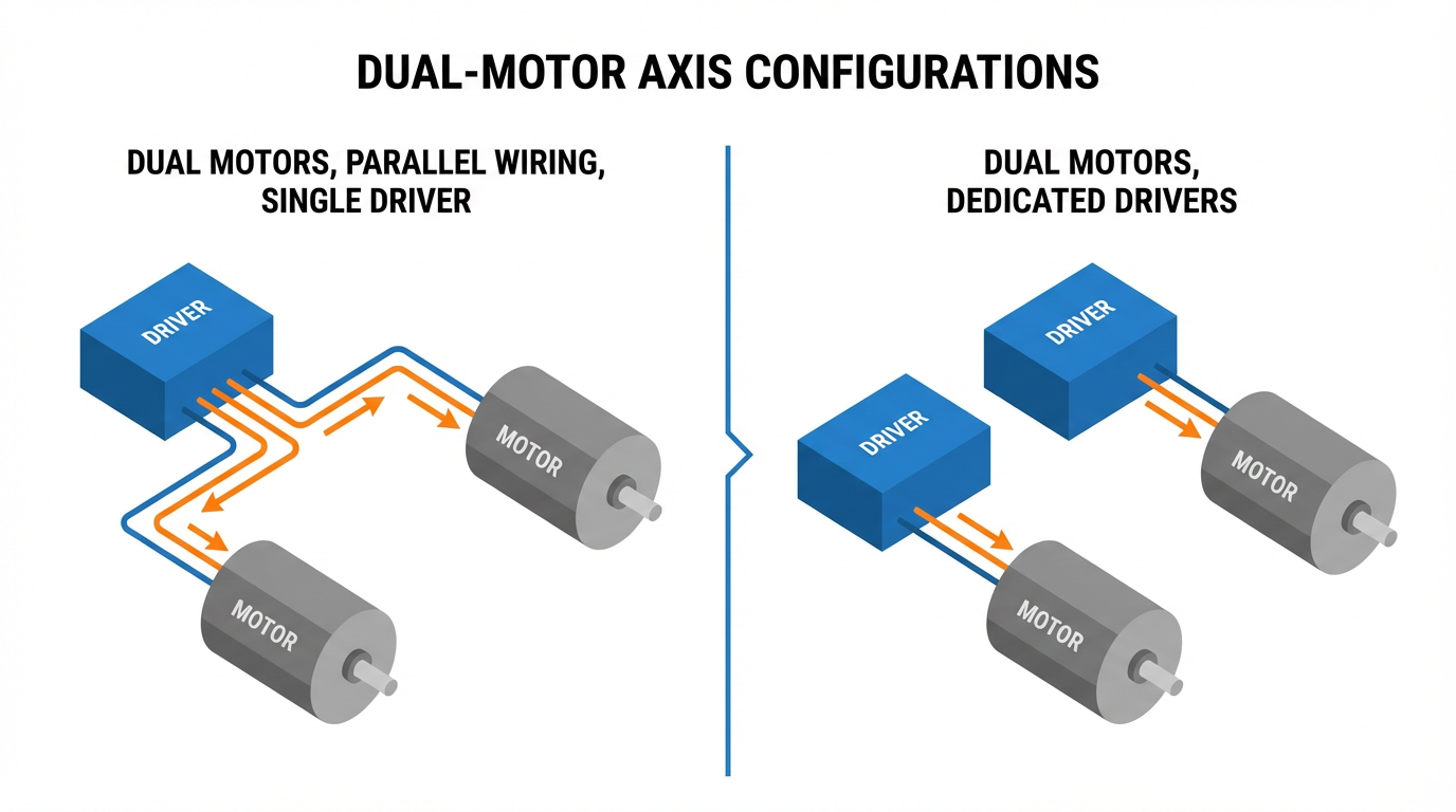 Finally, on small machines and 3D printers, people often wire dual Z motors in parallel to a single driver. A practitioner who runs dual Z steppers this way reports that they deliberately use robust CNC‑style drivers rated around 3 A, mounted on generous heatsinks, rather than tiny plug‑in modules. The message is straightforward. If you insist on one driver per two motors, the driver must be sized and cooled for the combined current.