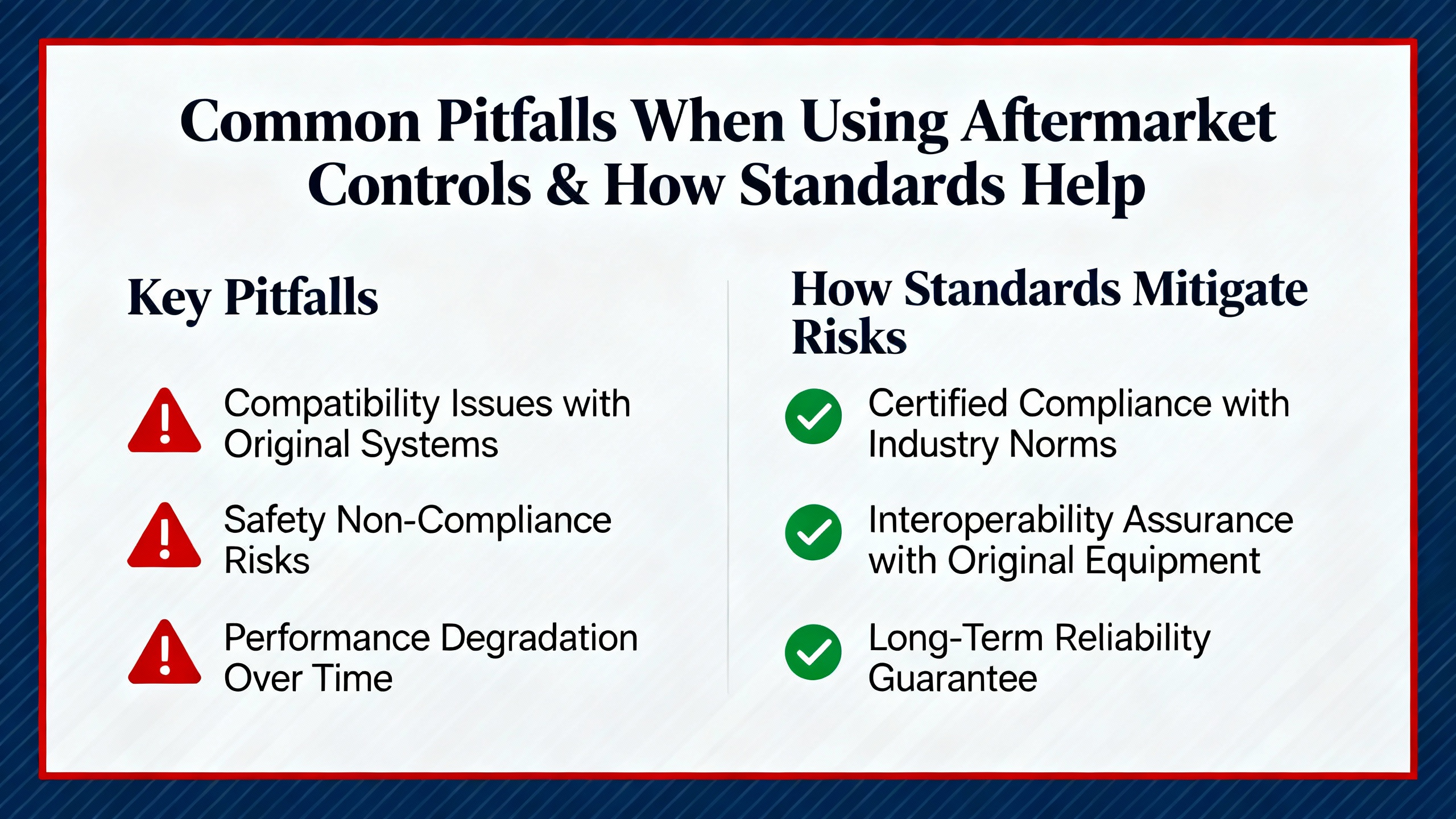Finally, integrate control-system quality into your broader risk and cybersecurity programs. ICS security frameworks call for asset inventories, risk assessments, and continuous monitoring, all of which depend on knowing what equipment you have and how it behaves. Aftermarket controls that fit into this framework make governance easier; those that do not become liabilities.