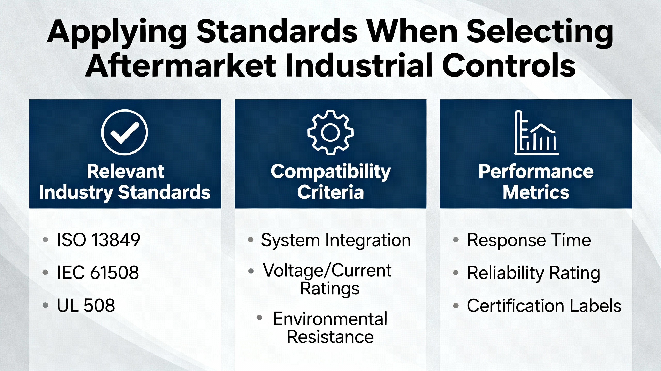 In the context of aftermarket industrial controls, it helps to group standards into three overlapping categories. First are quality management system standards, such as ISO 9001, that govern how a supplier runs its business, controls processes, and improves over time. Second are technical and safety standards that define how control components and panels must be designed, built, and installed, such as NFPA 79 for electrical safety of machinery or UL 508A for control panels. Third are functional safety and cybersecurity standards that define how control systems must behave in the face of failures and threats, such as ISA/IEC 61511 for safety instrumented systems and ISA/IEC 62443 or NIST 800-82 for industrial control system security.