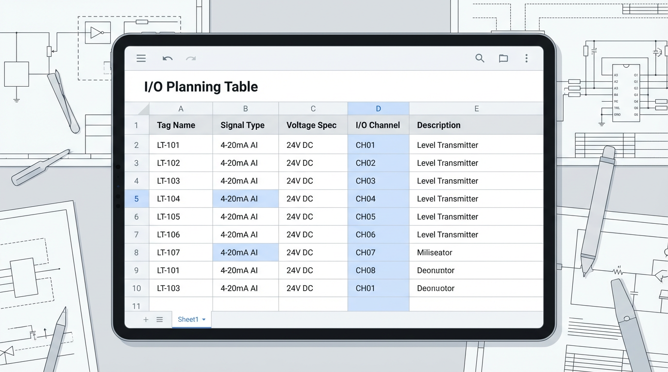 A disciplined way to do this is to build a spreadsheet with columns for tag name, description, signal type, voltage or current, physical location, and panel terminal.
