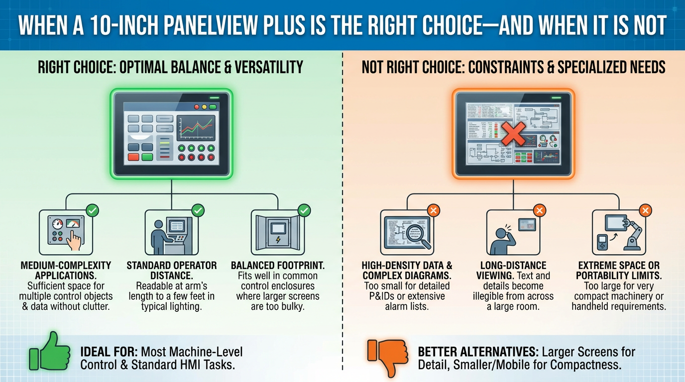 A 10‑inch PanelView Plus is a strong fit when you already have a Rockwell‑centric plant, your team is comfortable with FactoryTalk View Studio, and your IT policies discourage cloud dependency. It gives you sufficient screen space for meaningful visualization, tight integration with Logix controllers, and enough connectivity to bridge into older parts of the plant where needed. RealPars, Industrial Automation Co., and other Rockwell‑focused guides all position PanelView Plus as the stable, proven option for this kind of environment.