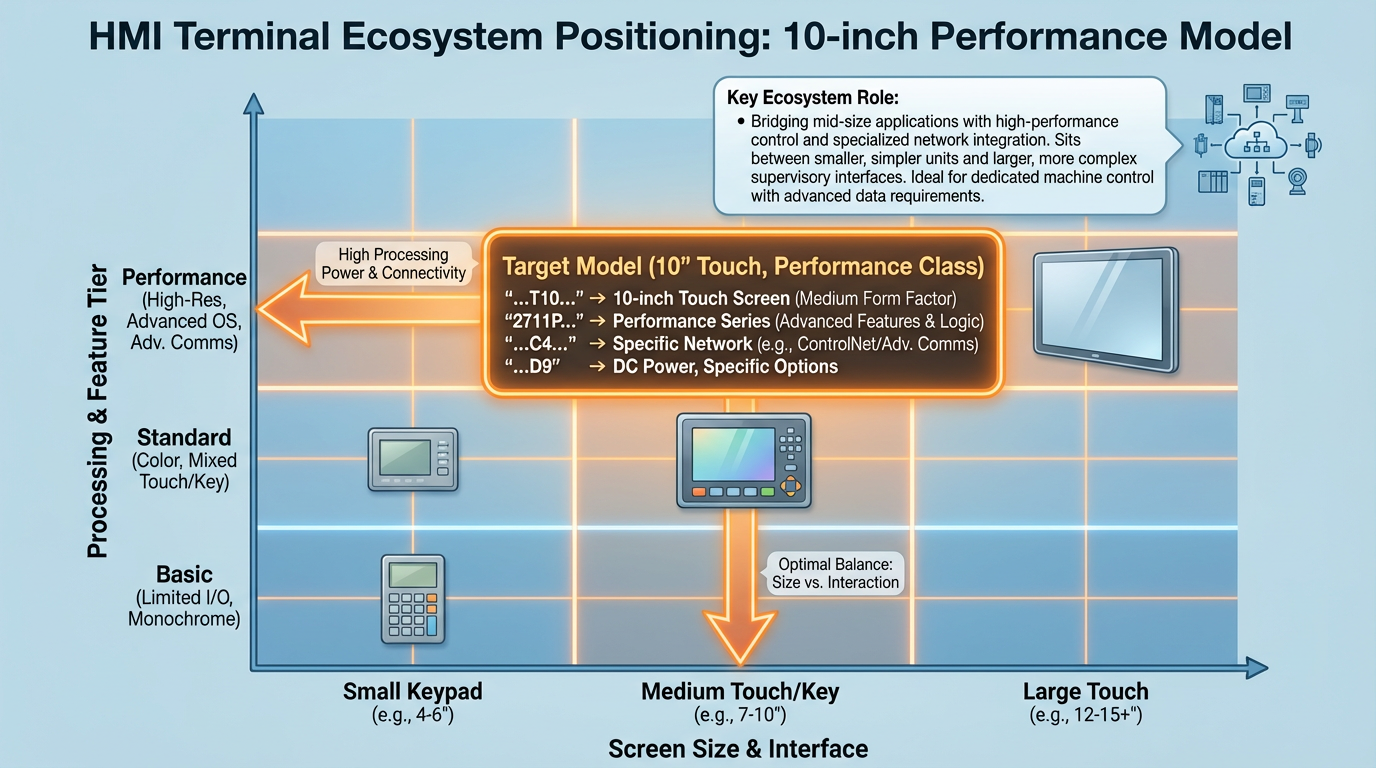 Within PanelView there are several subfamilies. RealPars and other Rockwell‑focused trainers split the modern lineup broadly into PanelView Plus (including the Plus 6 and Plus 7 families), PanelView 800 for smaller machines, and PanelView 5000 for tight Studio 5000 integration. The 2711P‑T10C4D9 belongs to the PanelView Plus line and uses a 10‑inch class color graphic display. That makes it a natural choice when you want more real estate than a compact 4‑inch or 6‑inch HMI, but you are not yet in the “full‑blown SCADA workstation” territory.