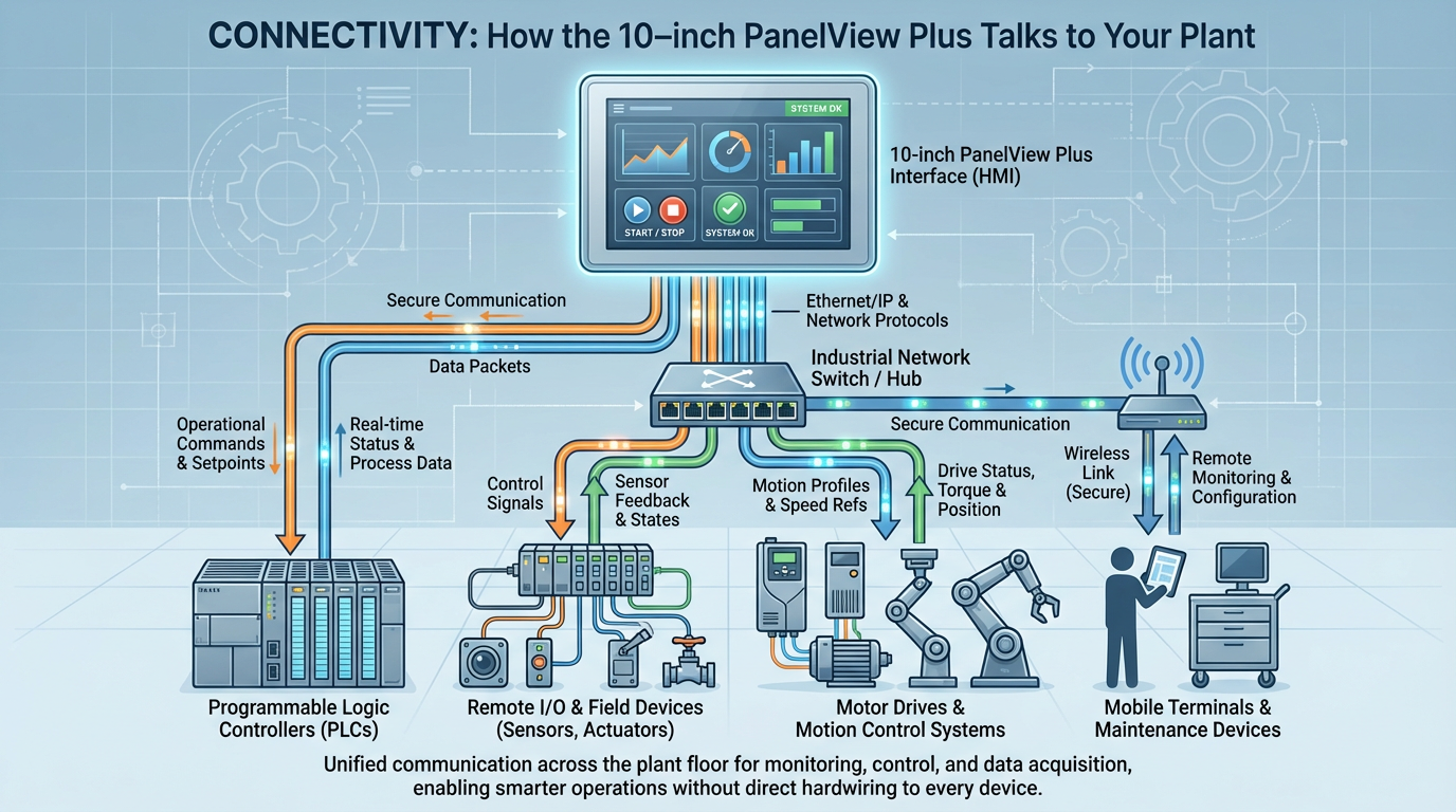 The key point is that a 10‑inch PanelView Plus terminal is not just a “screen on a wire.” It is a networked appliance with Ethernet, serial, optional legacy networks, removable storage, and built‑in remote access services. Depending on how you configure it, it can act as a straightforward machine HMI, a protocol bridge, a local historian, or a small information node.