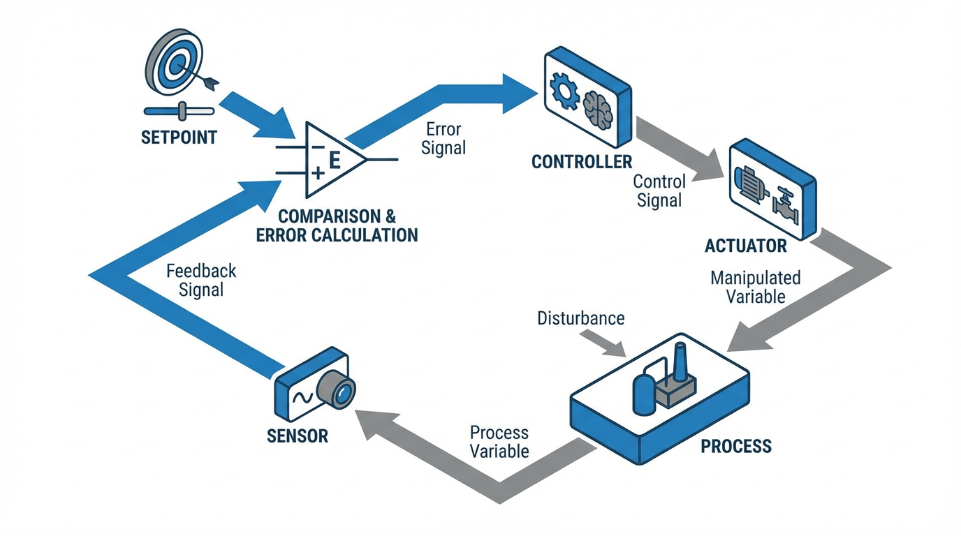 Controls engineers have used closed‑loop systems for decades in everything from thermostats to CNC. TechTarget and other references describe the pattern clearly. A closed‑loop control system measures actual output with sensors, compares it to a desired setpoint, calculates an error, and drives actuators to reduce that error. That loop runs continuously so the system can reject disturbances and hold the target state without an operator riding the knobs.