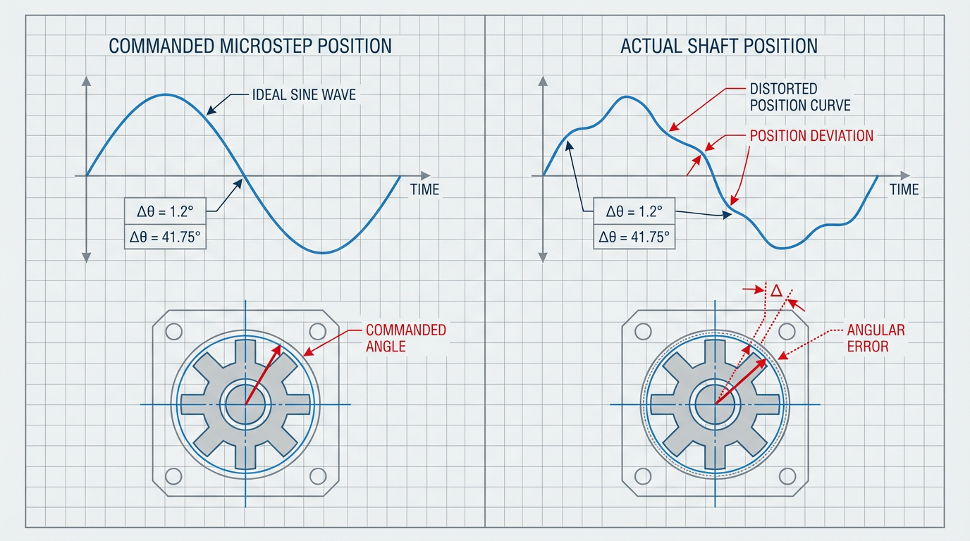 The limitations show up under stress. Source Robotics notes that engineers routinely oversize steppers by twenty to fifty percent simply to avoid stalls and step loss near the torque limit. Open‑loop drives often run at constant rated current, even at standstill, which wastes power and generates heat. RoboticsTomorrow and Galil Motion Control highlight resonance and vibration at particular step frequencies, which not only sound bad but can shake parts and contribute to lost position. And microstepping itself does not guarantee accuracy; the RoboticsTomorrow analysis points out that static friction and gravity can leave the final shaft position off by as much as a full step, even if you commanded many microsteps.