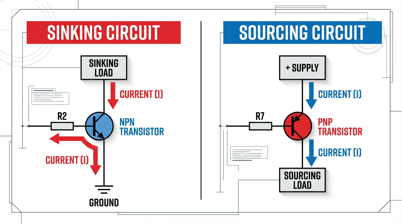 | Aspect | Sinking (NPN) view | Sourcing (PNP) view |