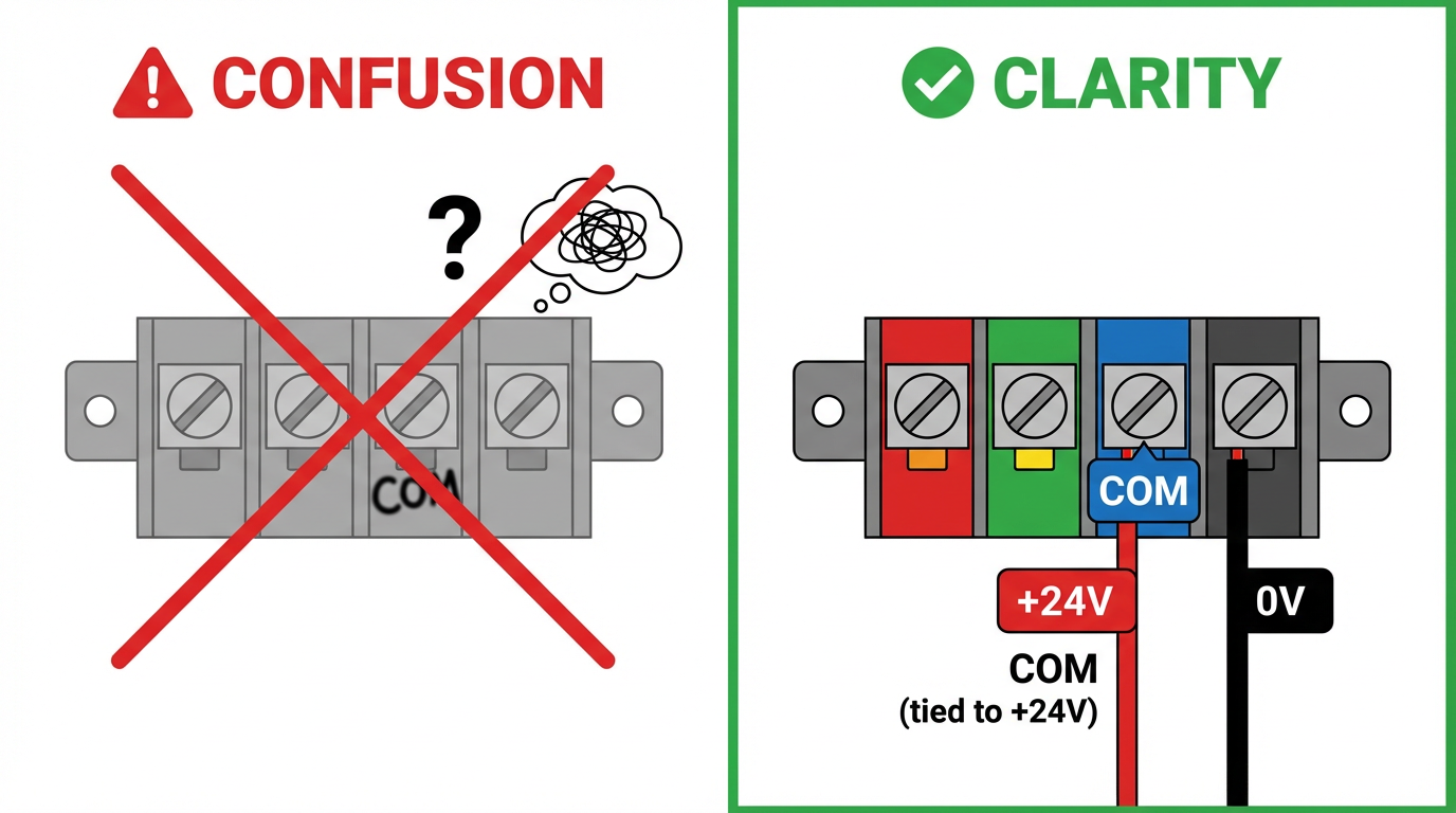 Because configurable modules make the concept of “common” explicit, they also encourage better labeling. Instead of a vague “COM,” you mark the terminal as “COM (tied to +24 V)” or “COM (tied to 0 V).” That labeling alone would have saved several hours in the forum example where the assumption that COM meant negative led troubleshooting astray.