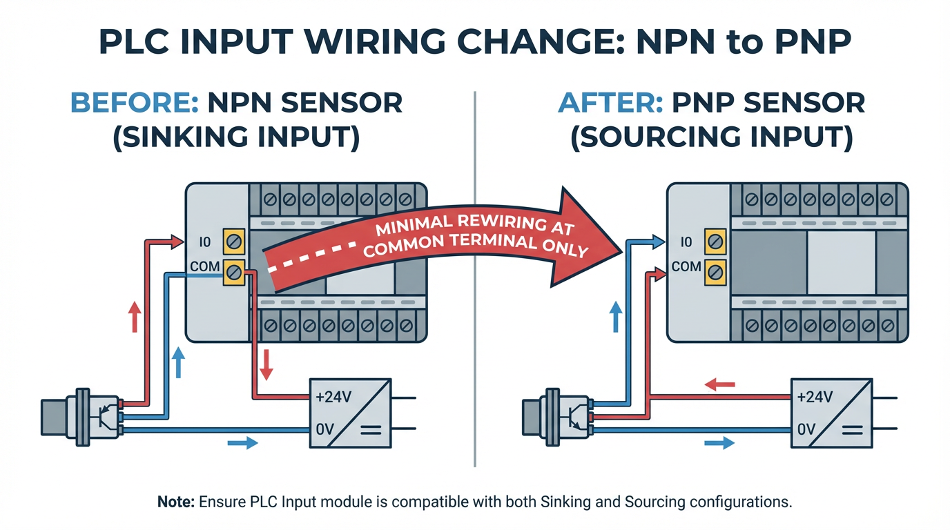 First, reuse an existing PLC card when a machine upgrade replaces NPN proximity switches with PNP models. You move the common from one side of the supply to the other and re‑label the block, instead of swapping hardware.
