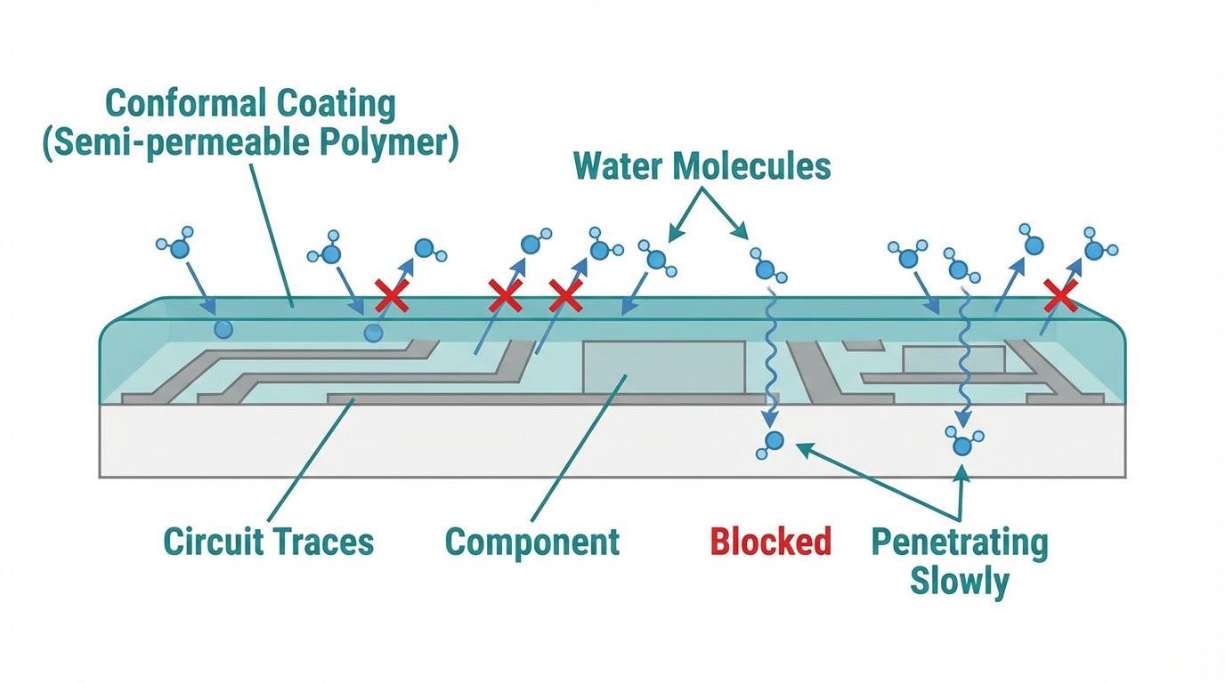 Conformal coating cannot reach into the laminate, so it does not eliminate these mechanisms. What it can do is significantly slow additional moisture ingress during field life, buying time between controlled drying at manufacture and the eventual accumulation of moisture in service.