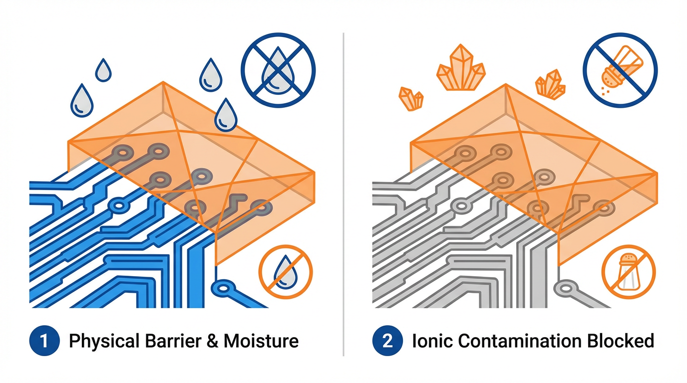 Conformal coating addresses surface leakage in two ways. First, it physically separates airborne moisture from conductors, so it is much harder for water films to form directly between exposed metals. Second, when properly applied and cured, it blocks or slows ionic contamination from reaching those surfaces, which dramatically reduces the conductivity of any moisture that does get through.