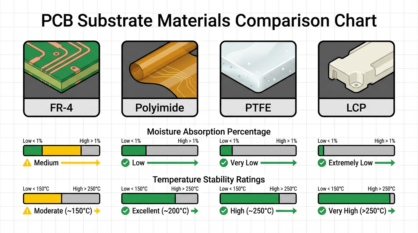 For harsh environments, LinkedIn and Sierra discuss moving beyond baseline FR‑4 to materials such as polyimide, PTFE‑based laminates, or liquid crystal polymer, which offer lower moisture absorption and better dimensional stability under humidity and temperature cycling.