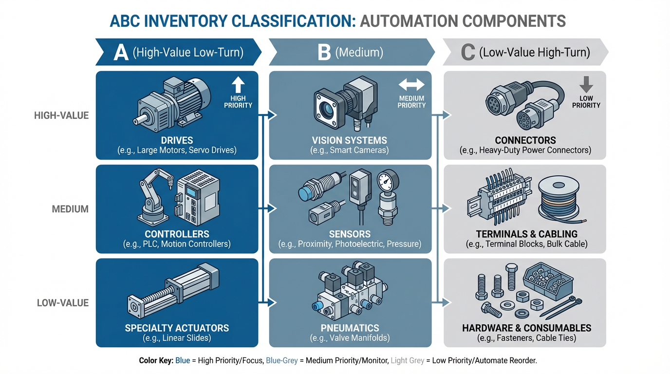 Not every automation part belongs in a consignment program. The academic work on consignment stock in industrial environments recommends targeting items with high annual consumption, small physical size, variable demand, and a real risk of obsolescence. Examples given include fasteners, small parts, tools, packaging, and personal protective equipment. In automation, many standard control and panel components behave similarly from an inventory perspective, even if they are more expensive than simple fasteners.