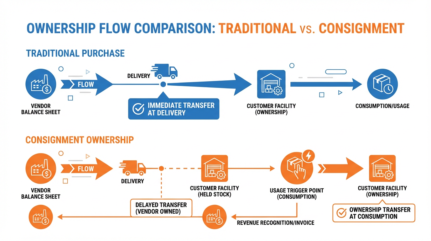 Consignment is not the same as simple vendor‑managed inventory. In vendor‑managed inventory, the supplier may plan and replenish your stock but you still own it. In consignment, the supplier both manages and owns the stock until the last step, when control truly transfers to you or your customer.