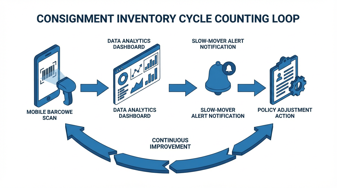 For ongoing control, several articles recommend regular cycle counts rather than infrequent full inventories. Ventory’s discussion of mobile cycle counting for consignment overstock explains that small, frequent counts with mobile devices and barcode scanning are more accurate and less disruptive than yearly shutdown counts. The data from those counts feeds analytics that highlight slow movers and discrepancies, which in turn drive adjustments to stock levels and policies.