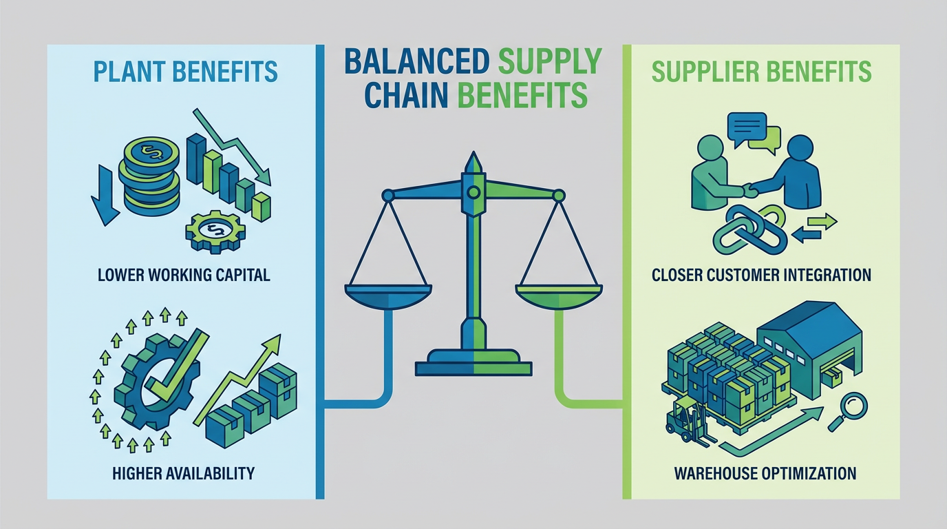 | Plant / end customer | Higher availability at point of use; fewer stockouts | Less working capital tied in inventory; PO workload reduced |