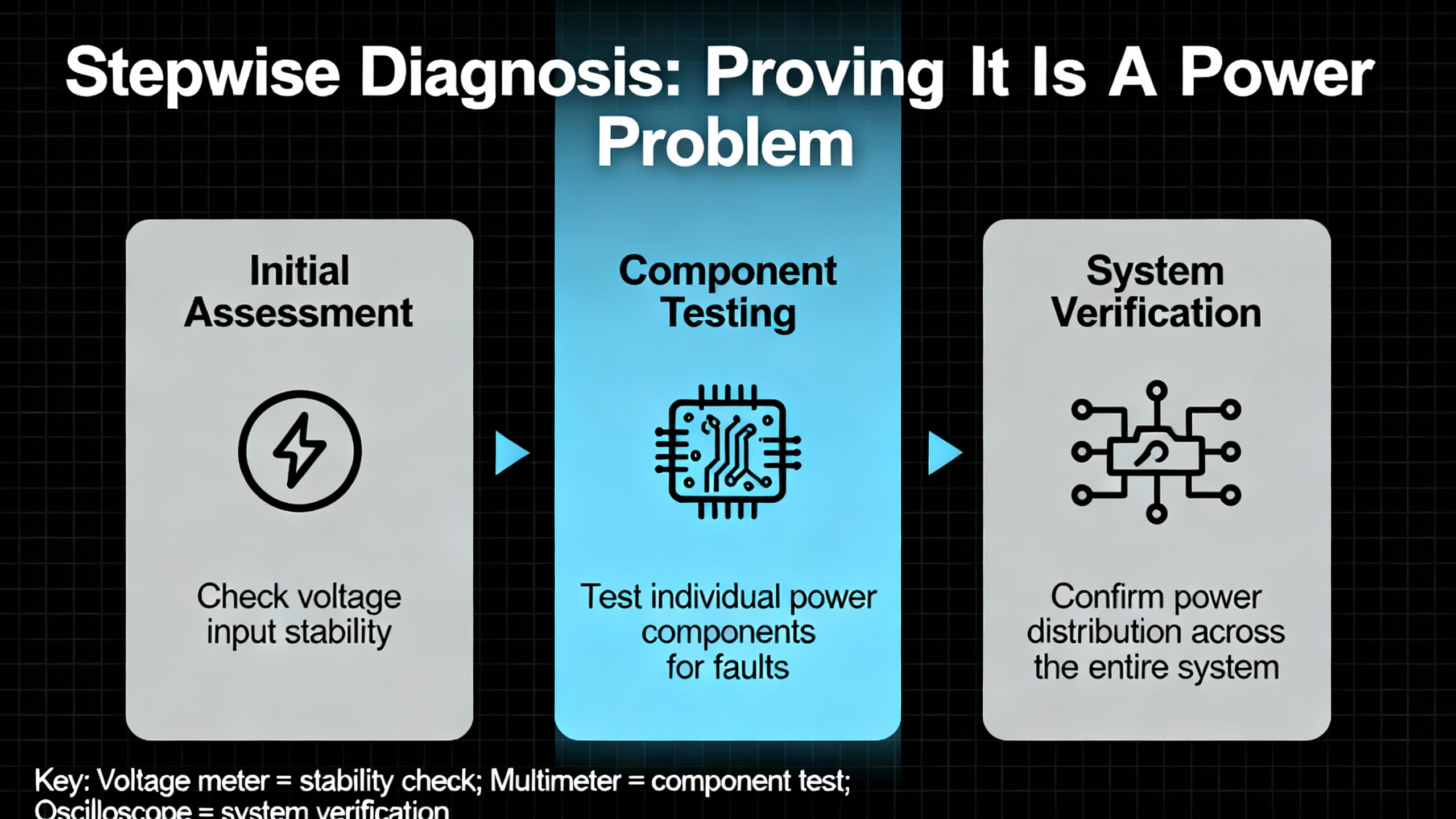 The goal of this phase is not yet to replace anything. It is to arrive at a defensible statement: the power module is good, the load is bad, or the module is the most probable failure point.