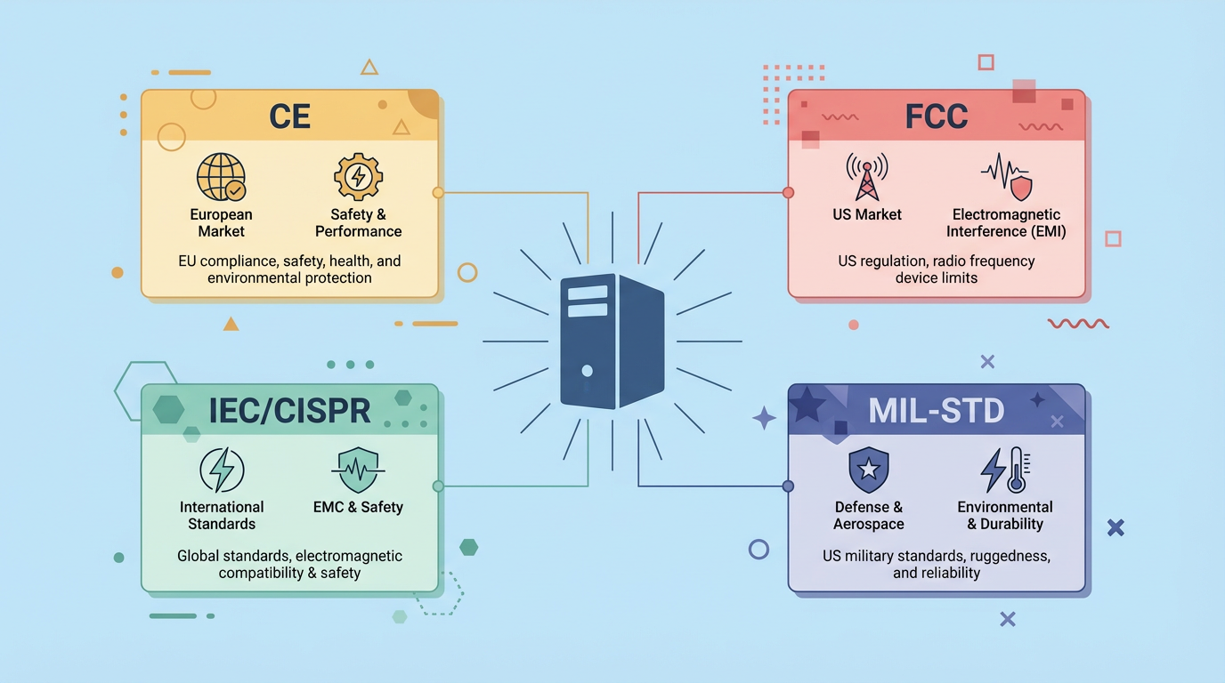 EMC is also a legal obligation. In the United States, FCC Part 15 regulates radio‑frequency emissions for almost all electronic devices before they can be marketed. In Europe, the EMC Directive and, for radio products, the Radio Equipment Directive define compatibility requirements. Compliance specialists like Compliance Testing and Astrodyne TDI emphasize that passing EMI and EMC testing is a prerequisite for market access. OnLogic makes the point that certifications such as CE and FCC should be treated as core design principles rather than after‑the‑fact paperwork.