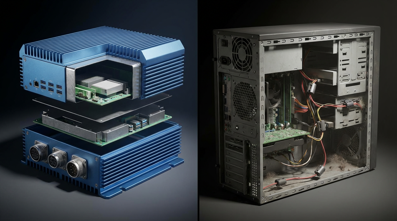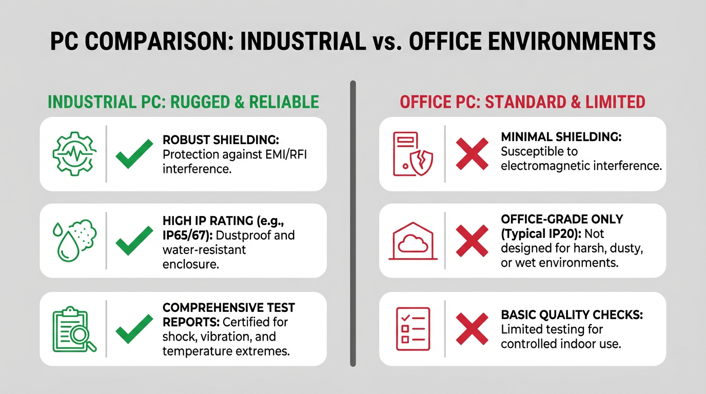 It can be tempting to specify an inexpensive office PC for light‑duty tasks such as basic HMI or data logging. To understand the risk, it is useful to compare how a certified industrial PC differs from a general‑purpose office system.