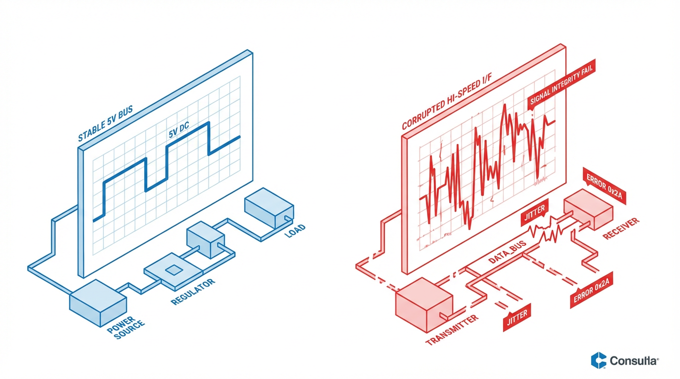 Modern industrial PCs and controllers are more vulnerable to EMI than older gear because their clocks run in the multi‑gigahertz range and their logic operates at lower voltages. As EMC Dorexs notes for computing systems in general, that combination makes digital signals easier to disturb. A short spike that would have been ignored on a five‑volt bus can flip bits on a low‑voltage high‑speed interface.