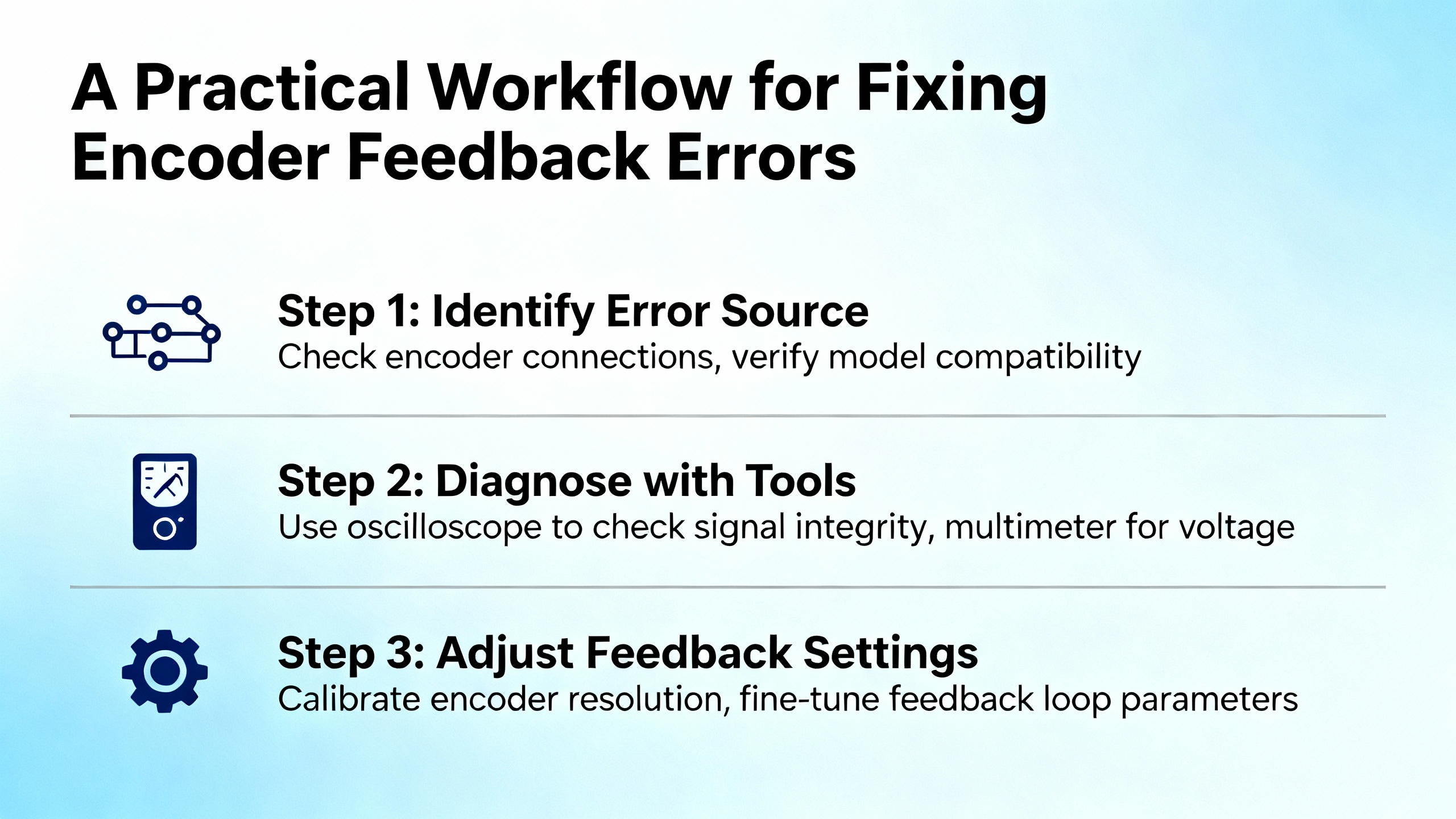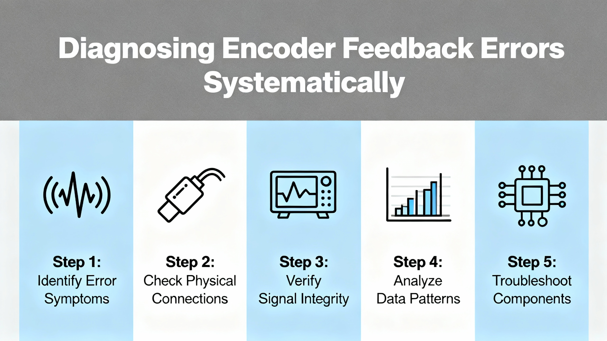 When a drive throws an encoder feedback fault or the machine clearly does not move as commanded, a structured diagnostic process saves a lot of guesswork. Field experience and repair guides point to three broad layers to investigate: symptoms, mechanical installation, and electrical integrity, followed by instrument‑based verification and calibration.
