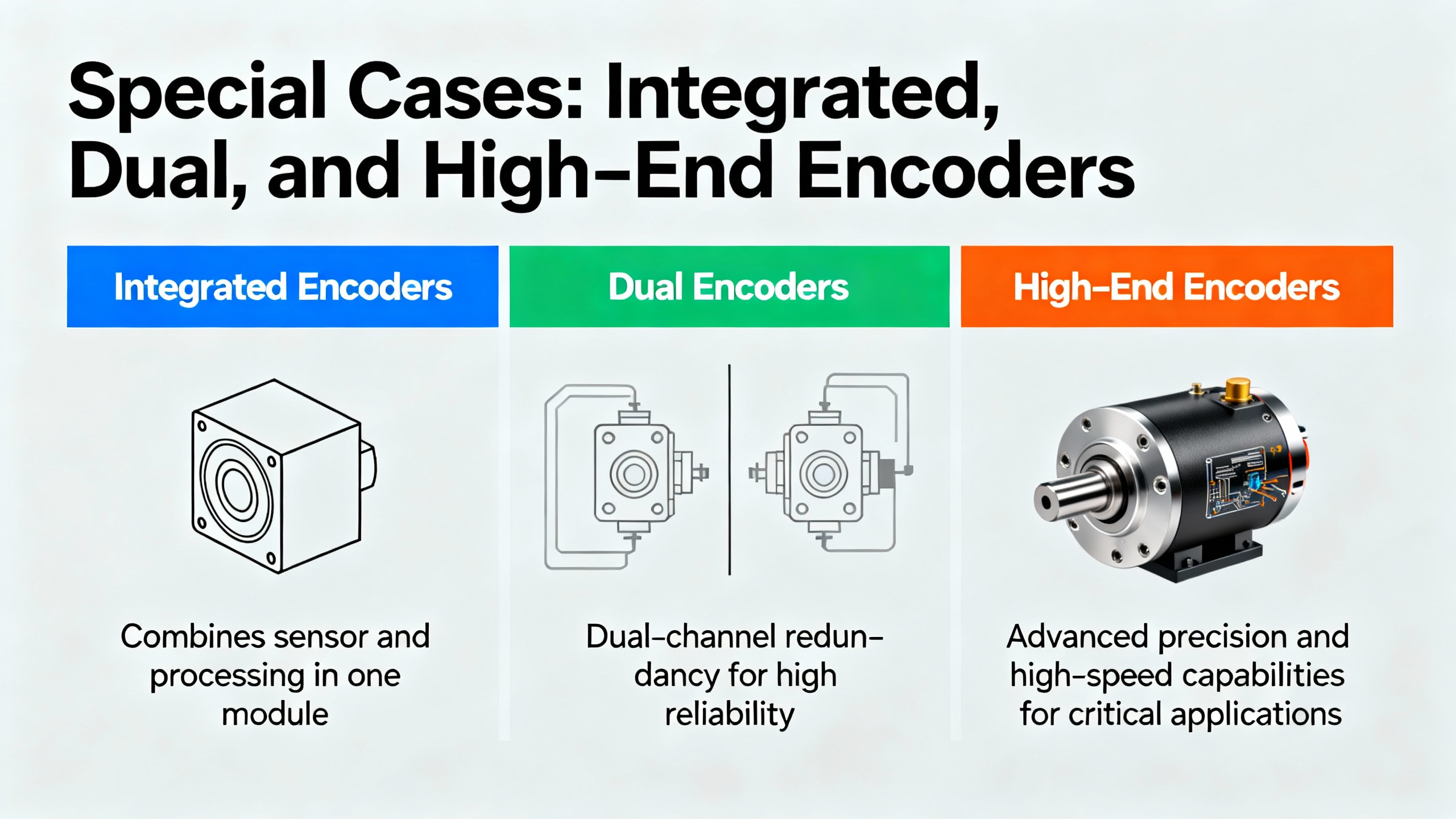 Some encoders embed more intelligence and complexity than a simple disc and sensor. Integrated dual encoders, high‑resolution absolute sensors used for commutation and position simultaneously, and space‑rated capacitive encoders all bring additional considerations.