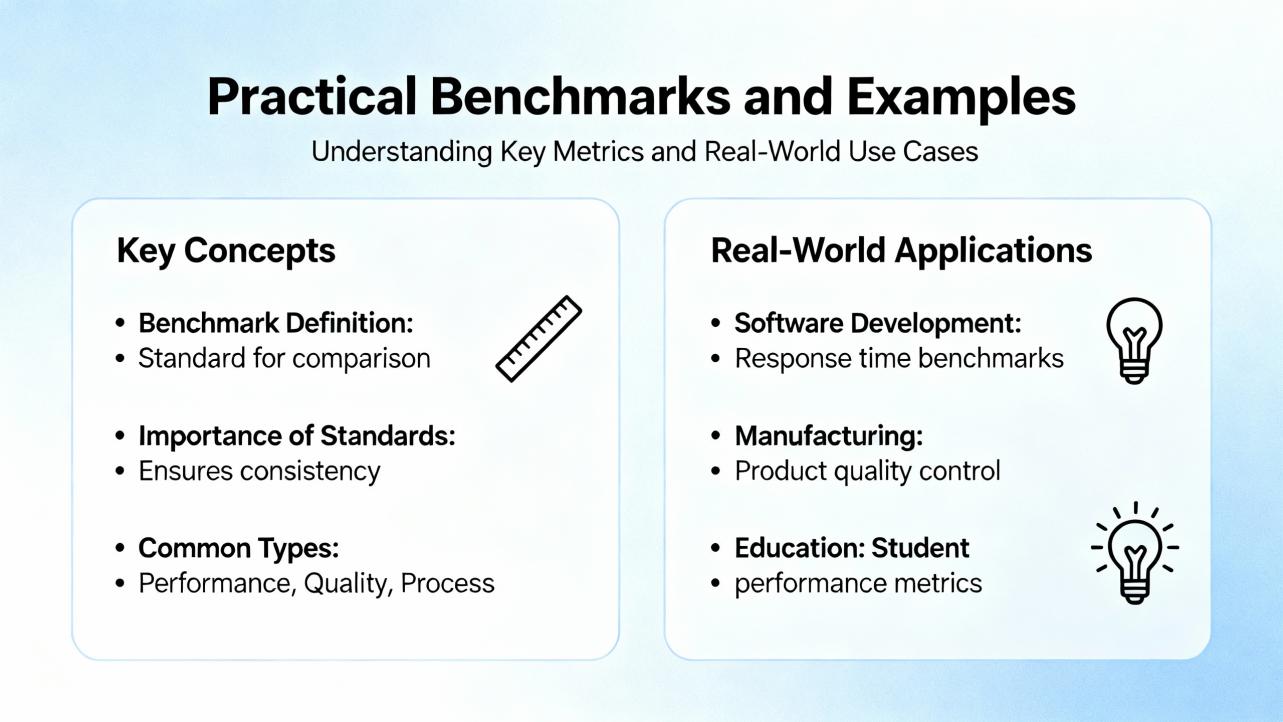 Benchmarks clarify expectations and reduce debate during execution. The following examples, adapted from AQI Service and related notes, illustrate objective criteria across different domains. They are directional and must be adapted to your equipment and standards.