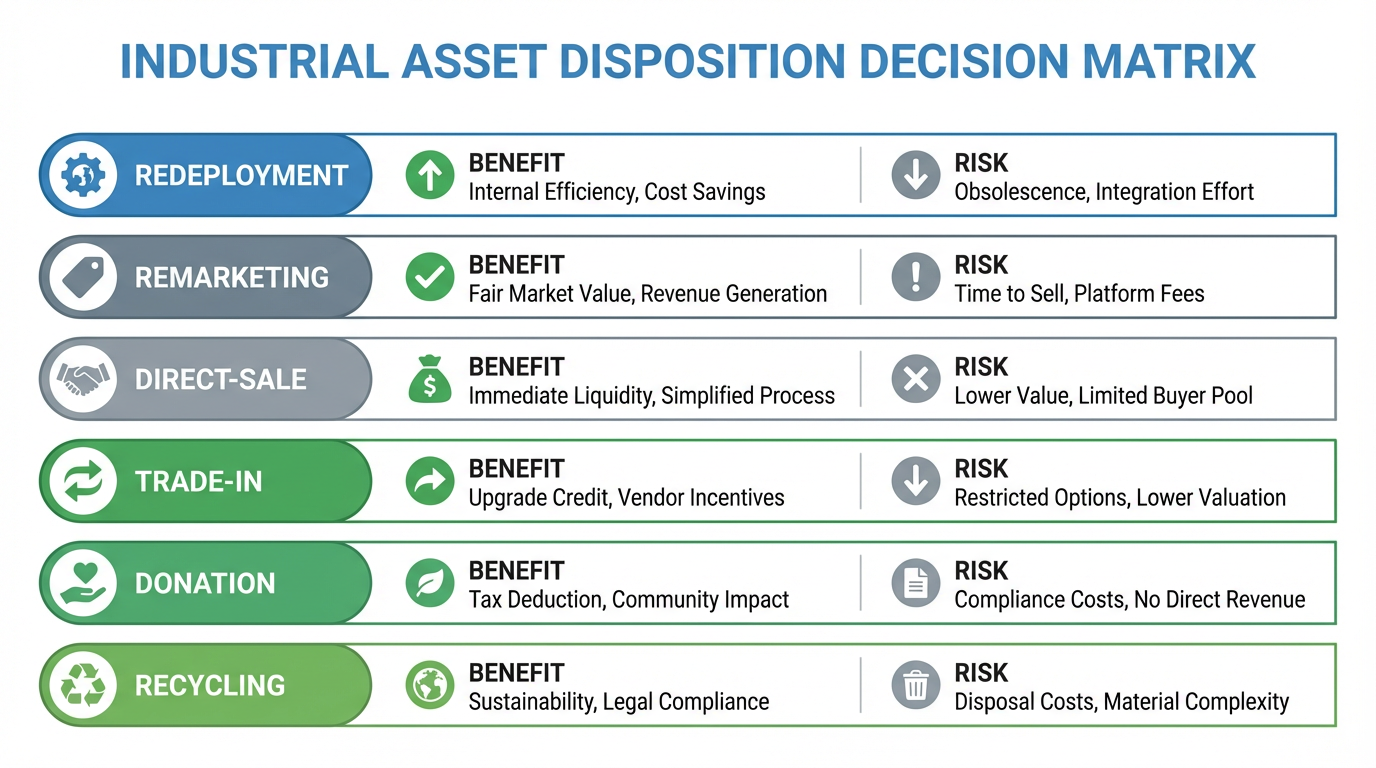 What matters from a plant manager’s standpoint is matching each asset to the right exit path rather than defaulting to whatever your local scrap buyer prefers.