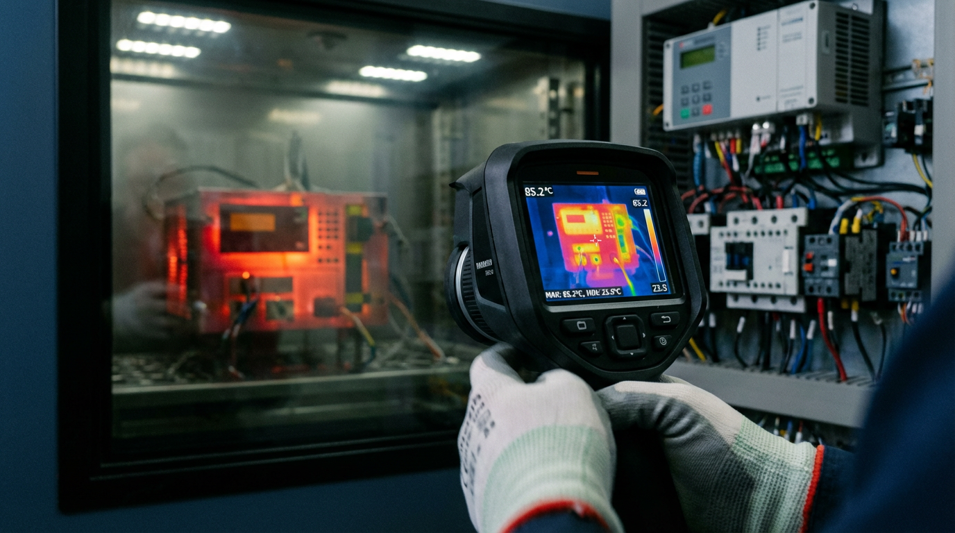 Sample preparation follows, including labeling, sensor placement, and pre‑test checks. During test execution, data loggers and software monitor temperatures, humidities, voltages, and system responses continuously. Thermal imaging, described in the AMREP article, is often used to identify hot spots under idle, maximum load, and transient conditions, using infrared cameras that can capture temperature distributions over a wide range.