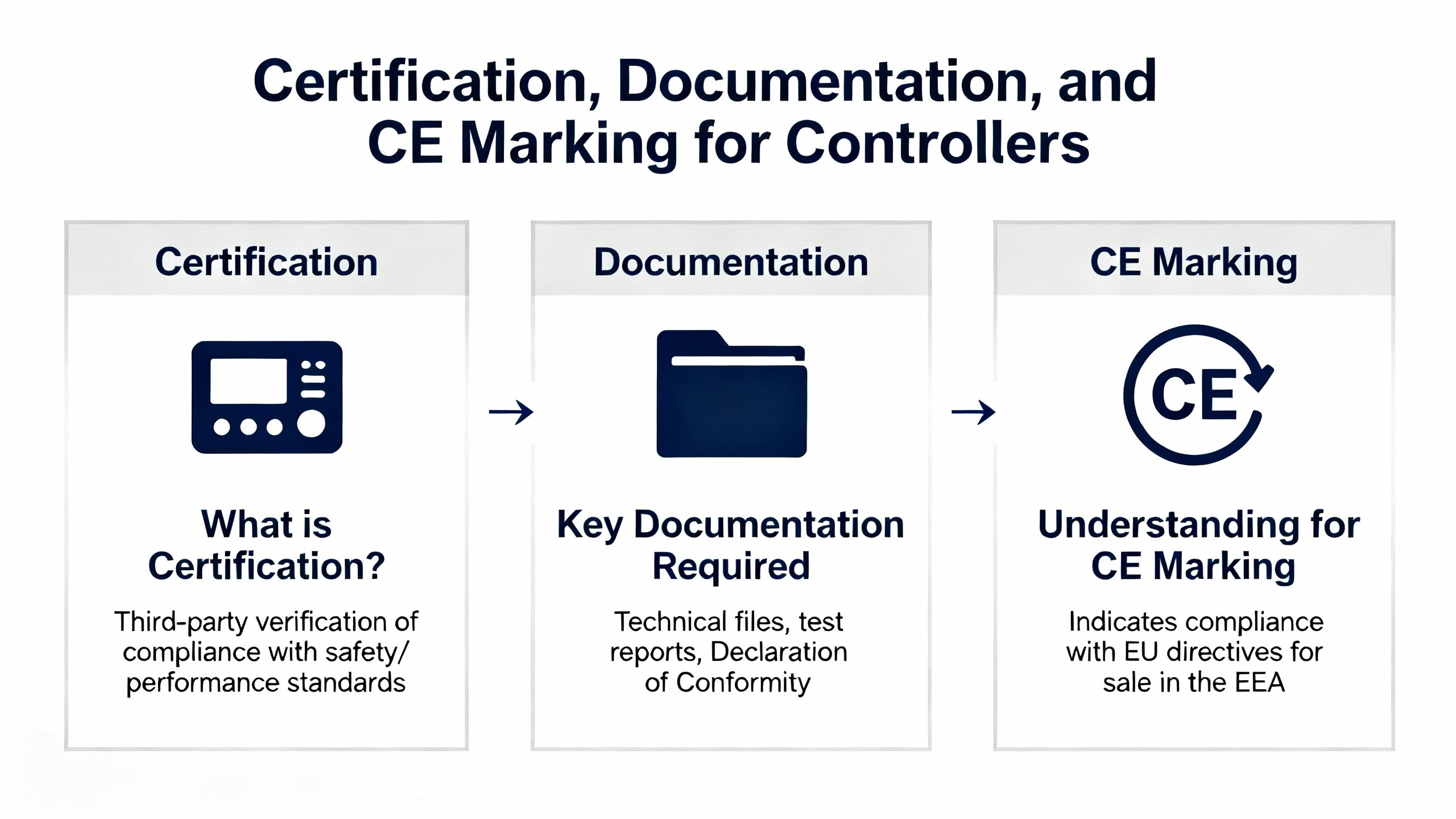 For completeness, EN 61000‑6‑1 and EN 61000‑6‑3 cover immunity and emissions for residential, commercial, and light‑industrial environments. Celectronics explains that these standards are intended for products sold to the general public and used in homes and offices, generally with tighter emission limits but less severe immunity levels than heavy industrial standards. That matters if your controller is used in small building automation systems or light‑industrial labs rather than on a heavy production line.