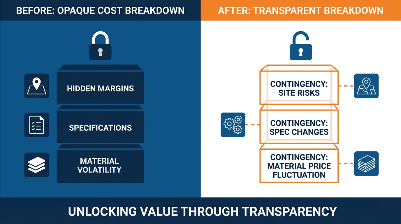 Overheads and risk should be explicit. Construction and estimation literature emphasizes formal risk assessment, scenario analysis, and structured contingency. Rather than hiding safety margins inside individual line items, a quote should define contingency allowances tied to specific uncertainties, such as unknown site conditions, ambiguous upstream specifications, or volatile material markets.