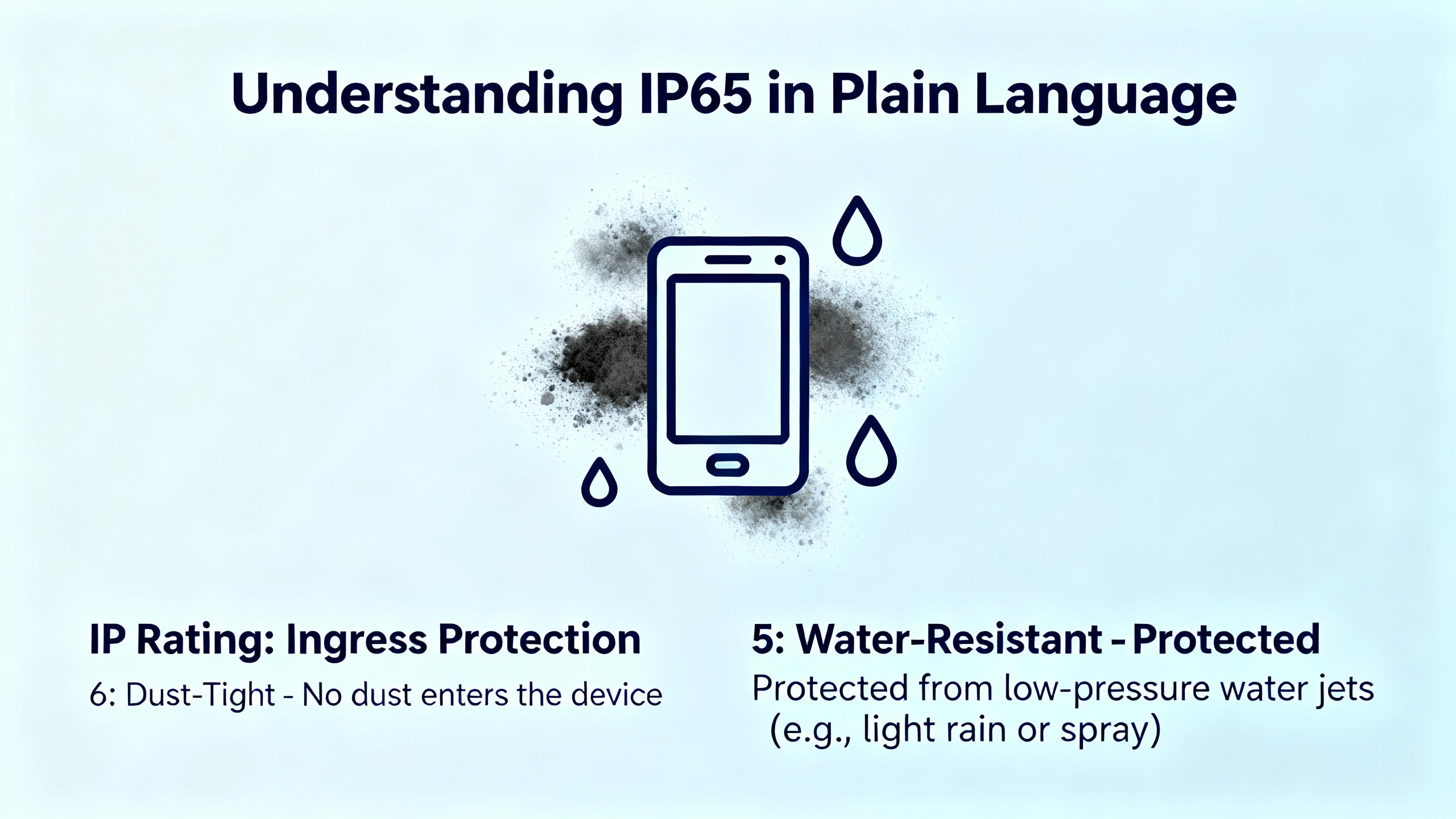 Ingress Protection, or IP, is a two-digit code that describes how well an enclosure keeps solids and liquids out. OnLogic explains it succinctly: the first digit rates protection against solids like dust, up to 6; the second digit rates protection against liquids, with higher numbers meaning stronger defenses. IP65 means “6” for dust and “5” for water, so fully dust-tight, and protected against low-pressure water jets or splashes.