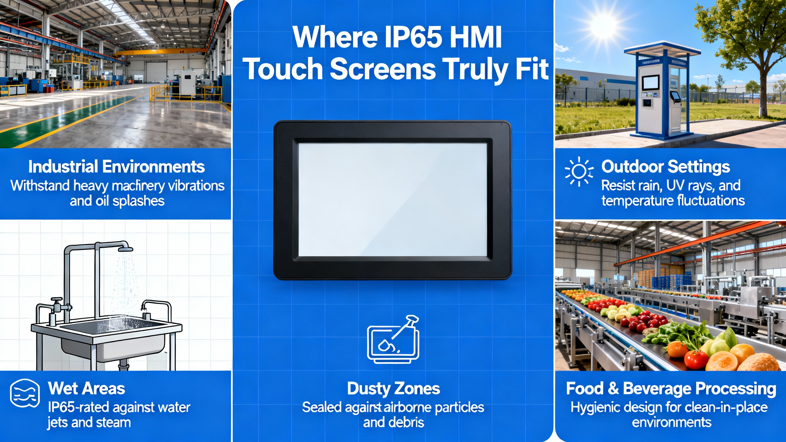 | Dusty or splash-prone industrial fronts | IP65 (front) | Factory assembly stations, machining cells, industrial cabinets and panels |