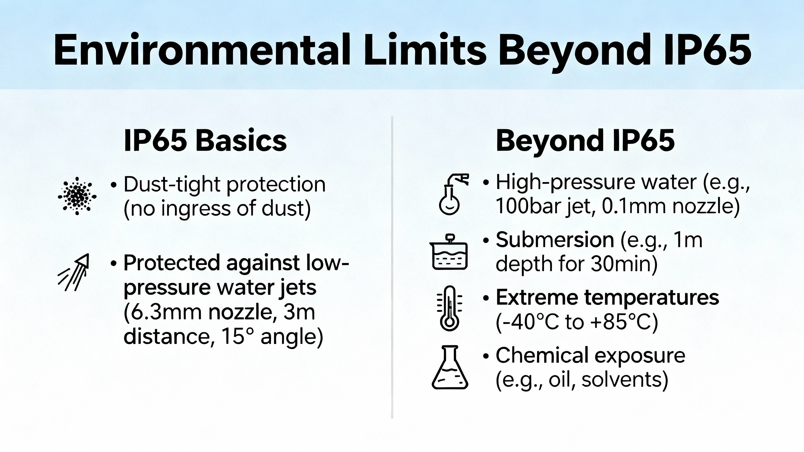The limitations arise when environments are wetter, hotter, or more aggressive than they first appear on paper. In food and beverage washdown areas, engineering teams often specify IP65 but sanitation practices include hot high-pressure foam. IndustrySearch and OnLogic caution that in such cases you must combine appropriate IP ratings with protective enclosures, seals, and in some cases IP66, IP67, or IP69K designs. IP65 alone is not meant for direct, high-pressure, high-temperature jet exposure.