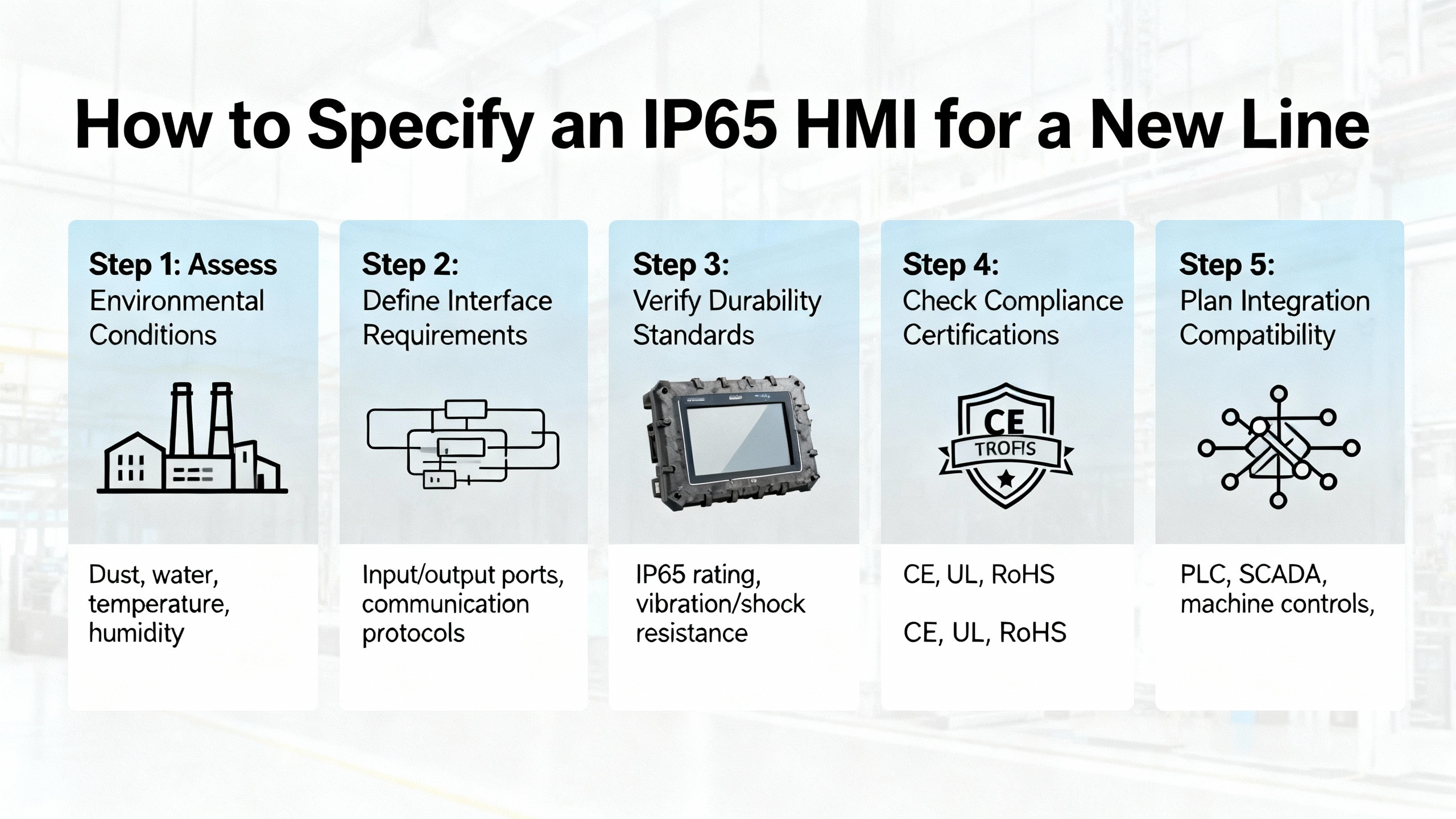 Finally, environmental controls around the HMI matter even when the device itself is rugged. IndustrySearch and Unisystem both emphasize using covers, filters, and climate-controlled housings in extreme environments, along with shielding from direct sunlight and chemical exposure. IP65 is a foundation, not a full risk-mitigation strategy.