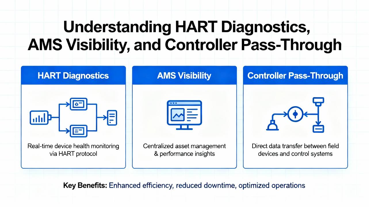 A vendor write‑up summarizing Emerson controller capabilities notes that HART information can be passed from field devices to workstations for remote device management. That feature is implemented at the system level and depends on controller and network configuration, not solely on the AI card. If HART appears missing even when the analog values look correct, do not assume the input module is at fault; check controller pass‑through settings and AMS visibility first.