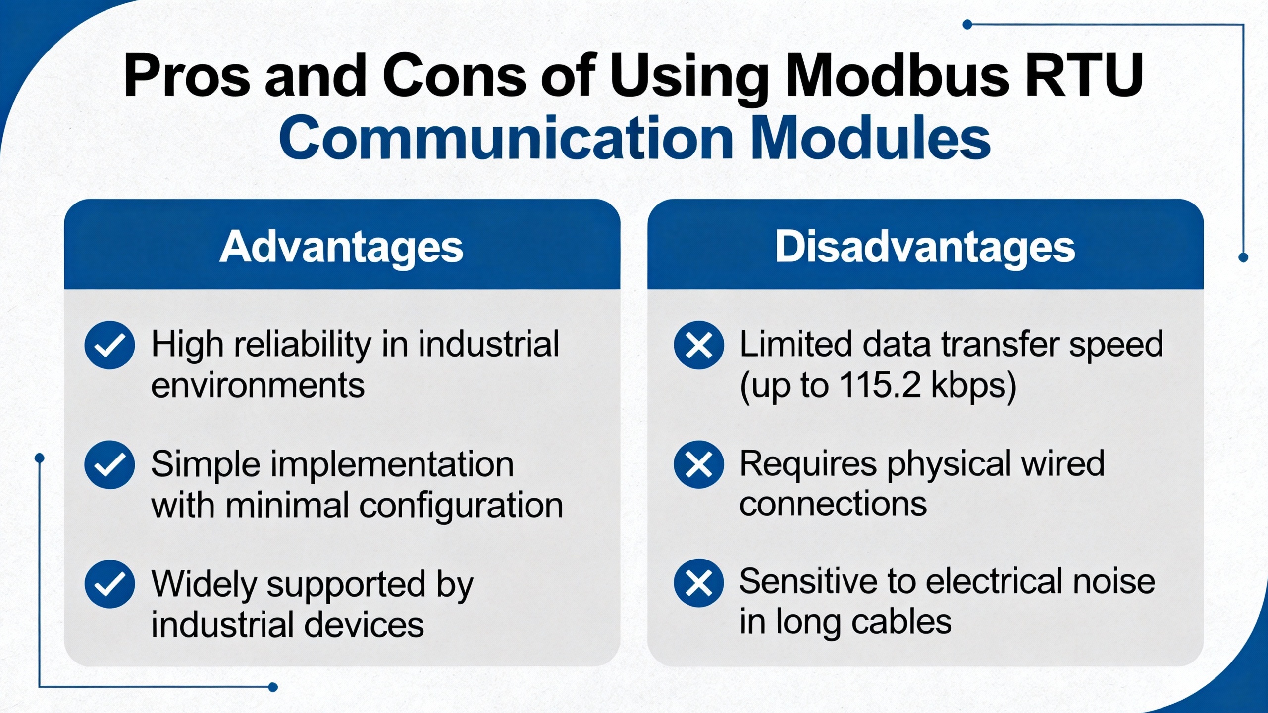 The pros and cons of sticking with Modbus RTU behind a communication module versus going straight to Ethernet‑based protocols can be summarized from RTA Automation, RealPars, Maple Systems, and Redz.