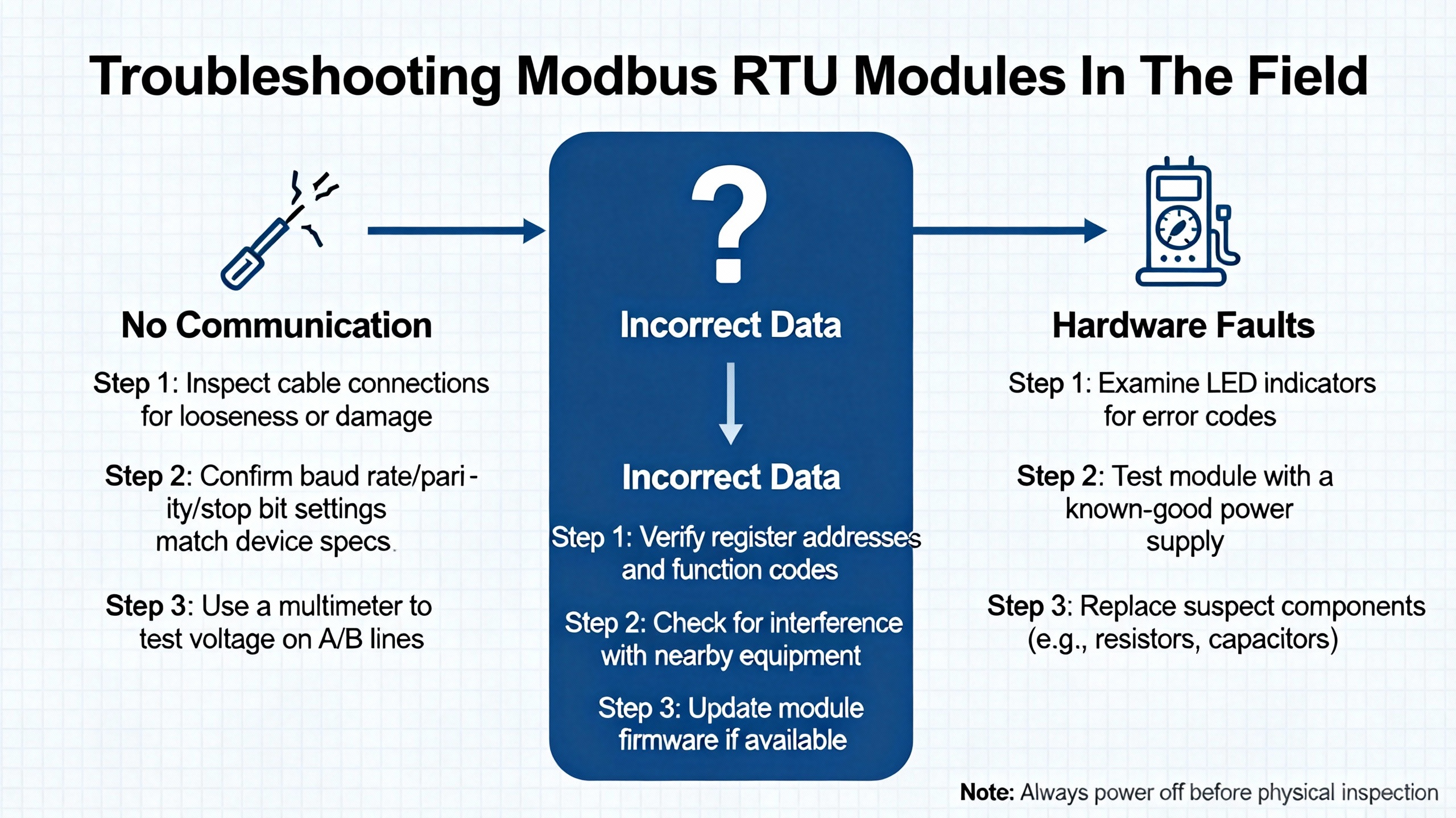 Most Modbus RTU communication modules are reliable when configured correctly, but real‑world installations still generate many support calls. AutomationForum’s troubleshooting procedure and RTA Automation’s “Wingdings and troubleshooting Modbus comms” article both outline patterns that align well with field experience.