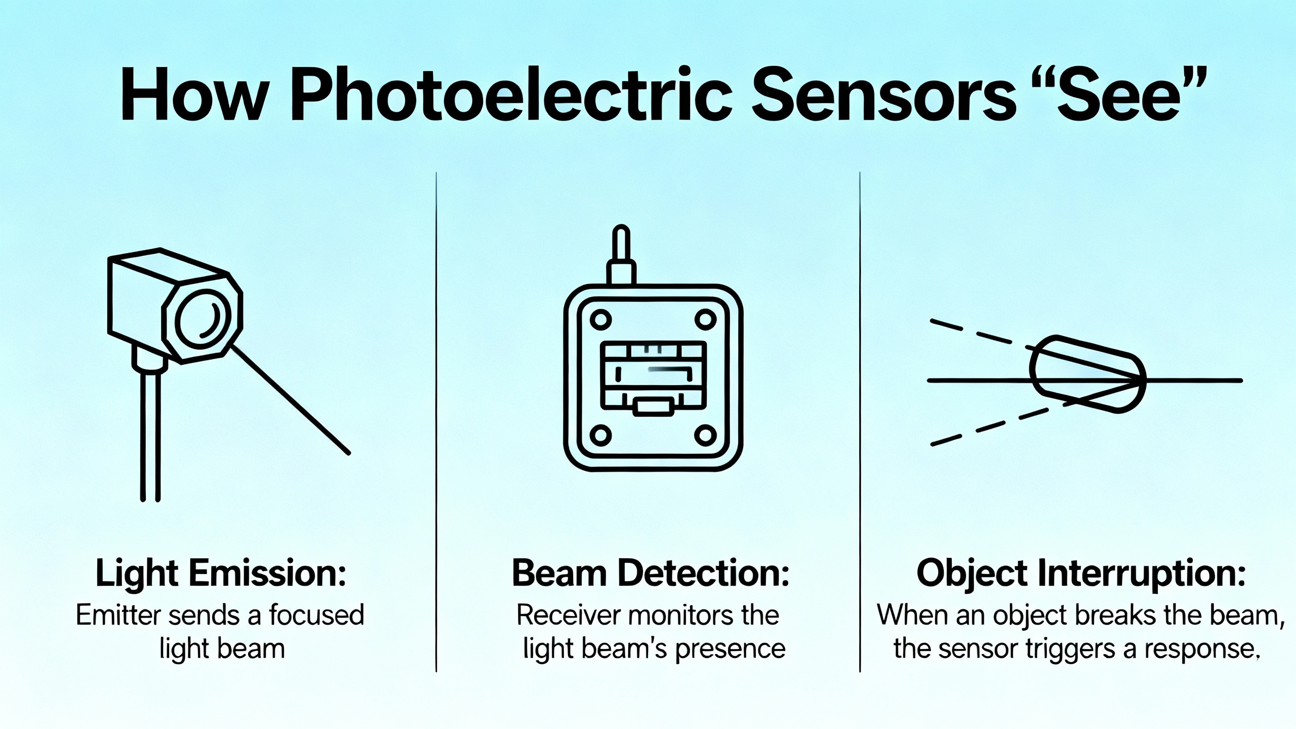 Photoelectric sensors are non-contact devices that use light to detect objects. According to Omchele and multiple industrial automation sources, the core elements are an emitter (often an LED or laser), a receiver, and supporting electronics that turn the received light into an electrical signal. The sensor decides “object present” or “object absent” based on changes in that signal.