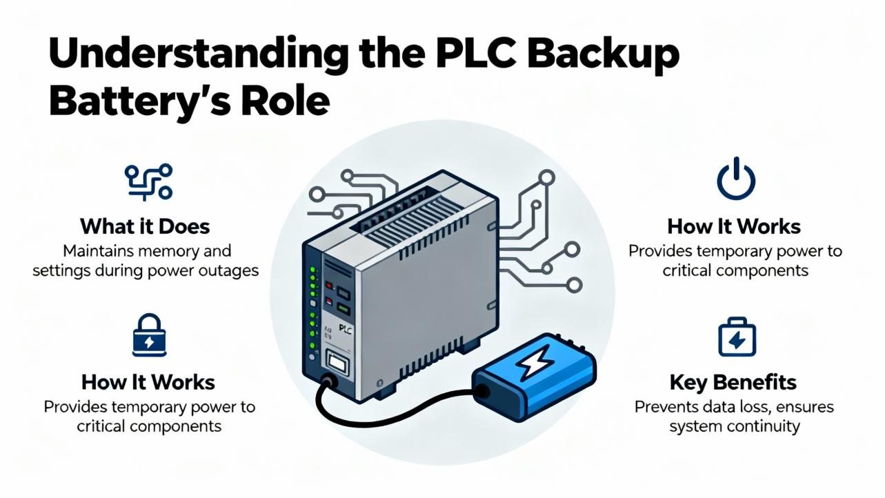 A PLC’s backup battery keeps volatile RAM alive when the main power is off so logic, configuration, setpoints, and the real‑time clock survive outages. That’s the entire mission. The moment external power is restored, the CPU stops sipping from the battery. Modern controllers often blend non‑volatile memory with RAM, but even then, RAM is still used for retentive tags and runtime data. When the battery is dead and power is lost, volatile content is at risk. Both Automation Forum and PDFSupply emphasize this point, noting that the controller can run perfectly with a dead battery while powered, but once power drops you can lose programs and data retained in RAM.