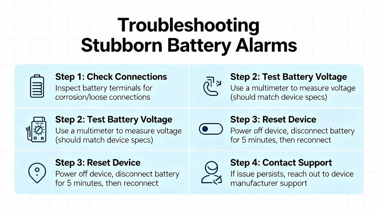 If the alarm persists across known‑good parts and reseating, measure the voltage at the CPU end of the battery lead to confirm the harness and board connection. I’ve also seen third‑party packs where the polarity inside the connector shell was reversed relative to OEM; those look fine and fail quietly. When in doubt, consult the vendor’s parts list and documentation rather than force a “compatible” solution.