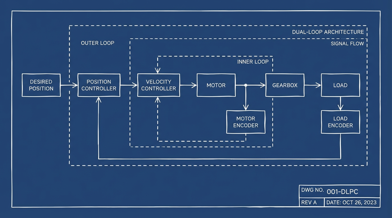 The dual‑loop approach solves this by closing an inner velocity loop around the motor using its encoder and an outer position loop around the load using the load encoder. The position loop generates velocity commands proportional to position error and feeds them to the velocity loop. In this way the system maintains stable motor behavior while correcting for mechanical slop and compliance at the load.