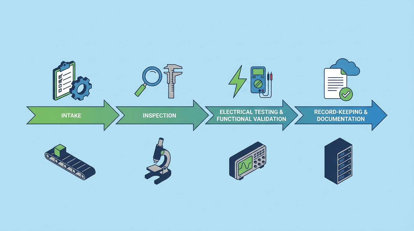 Once an item passes triage, technical inspection and testing begin. Industrial inspection guidance stresses inspection across stages, not just at final acceptance. For used controls, this includes:
