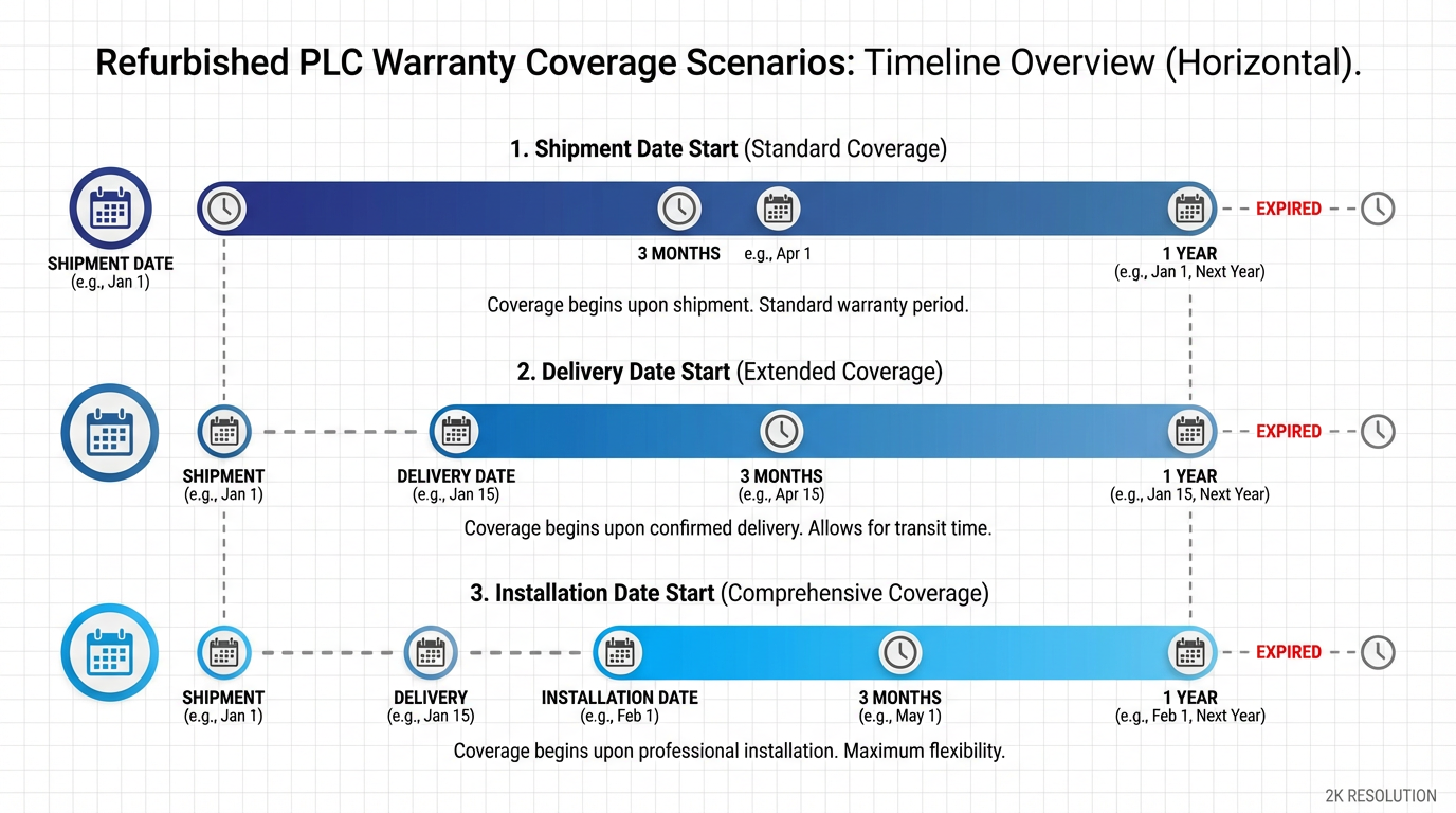 In practice, this matters for spares on the shelf. If you buy a refurbished PLC as a spare and it sits untouched for six months before installation, a twelve‑month warranty starting at delivery gives you six months of in‑service coverage; a three‑month warranty might expire before you ever power it up. For high‑value spares that may sit for a while, it is worth negotiating either a longer term or an installation‑based start date.