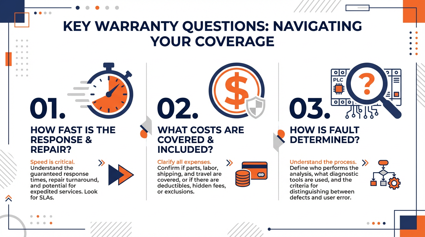 Qviro’s industrial automation warranty guide calls out five clauses that engineers should always review. Those same five show up repeatedly in refurbished PLC warranties and are worth treating as a checklist.