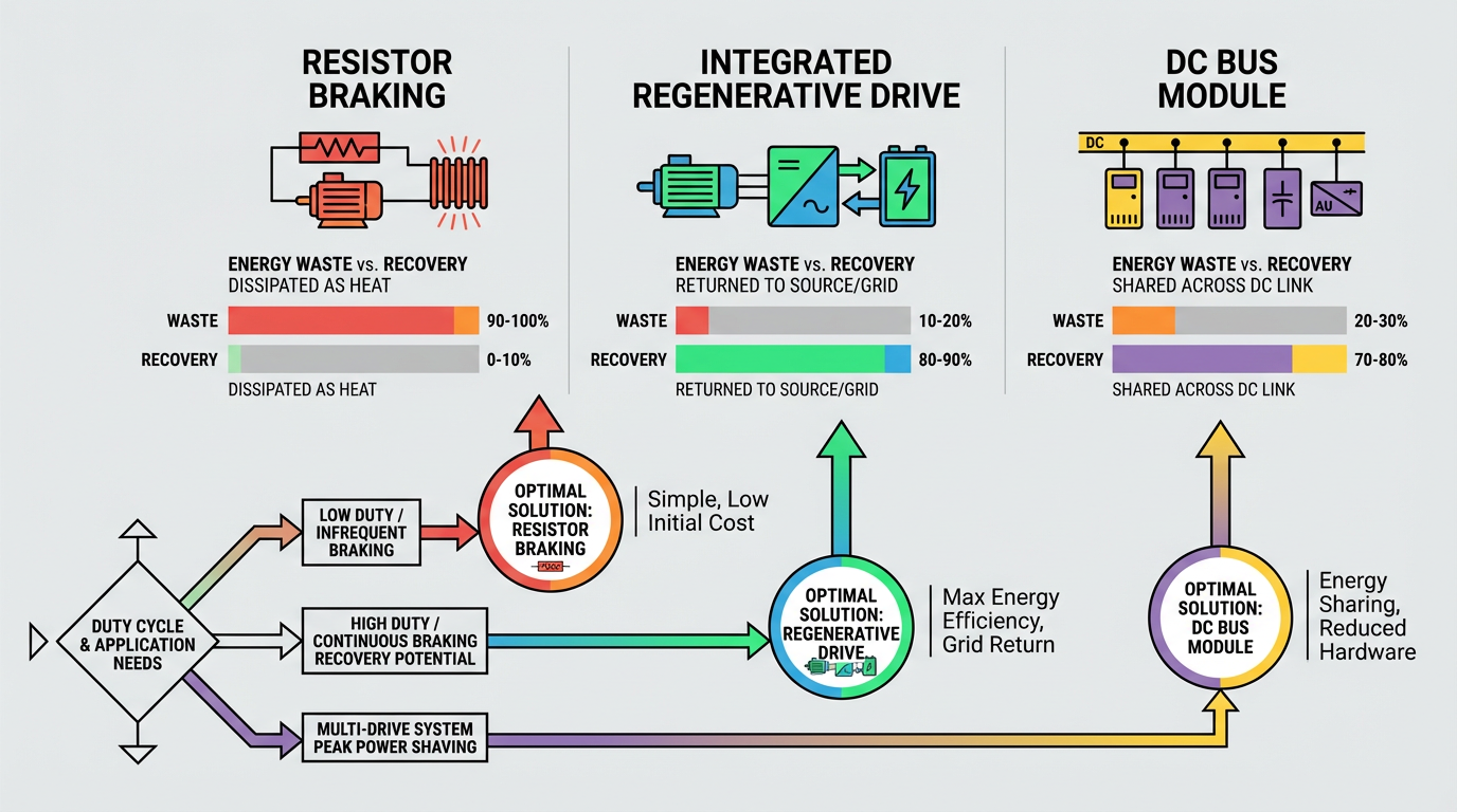 | Regenerative module on DC bus | Shared across drives on common DC bus, surplus can feed AC grid | Multi‑axis systems, DC microgrids, mixed motoring and braking | Maximizes internal energy reuse, scalable architectures | Requires DC bus design, coordination, sometimes storage |