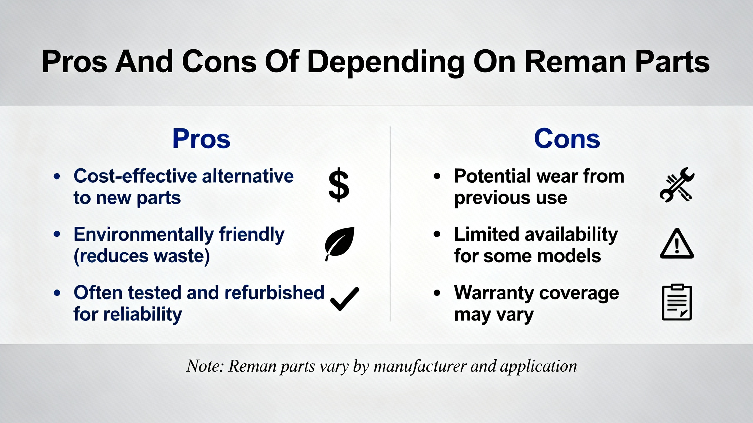 Ask about warranties and what happens when a reman part fails early. Reputable suppliers cover workmanship, explain how they separate wear from defects, and welcome failure analysis because it improves their process. Shops that offer no warranty or only nominal coverage, especially when combined with very low pricing and limited documentation, are effectively telling you that they do not expect to see the part again and are not planning to support you if it does fail.